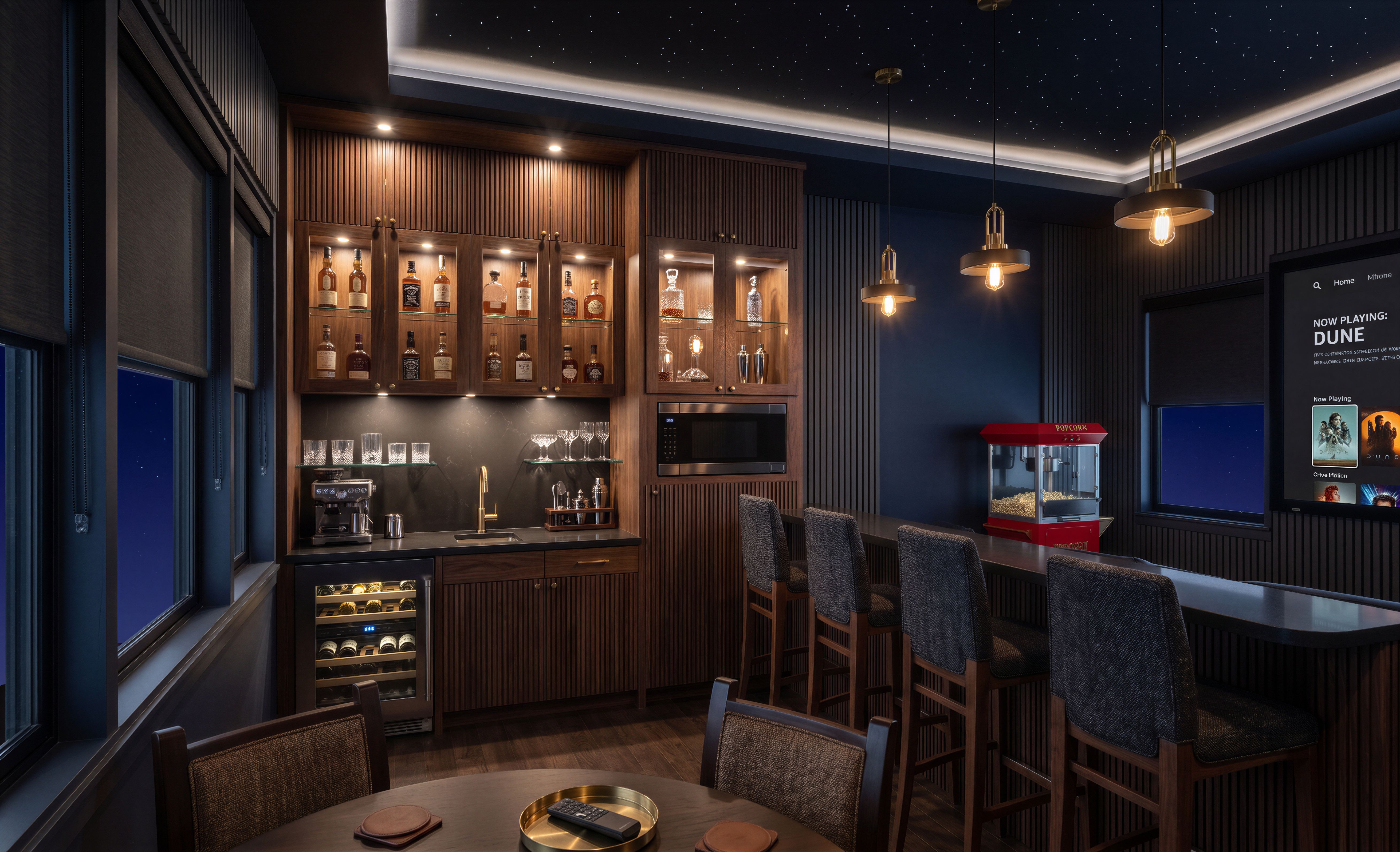 Make photo-realistic rendering of this media room; Add wall design as appropriate for a media room and trending now; Add night sky ceiling design as appropriate for a media room and trending now; Add colors as is a trend now for a media room; Picture right of the back window is a projection screen; Add light fixtures as appropriate, light fixtures on; Add appropriate items to the current wet bar cabinets; Glassware on glass shelves above the countertop; There is a popcorn machine next to the existing window; Windows have blinds as appropriate for a media room; Only skies are seen through the windows; Do not add extra windows; Do not add another window;, keep exact camera angle