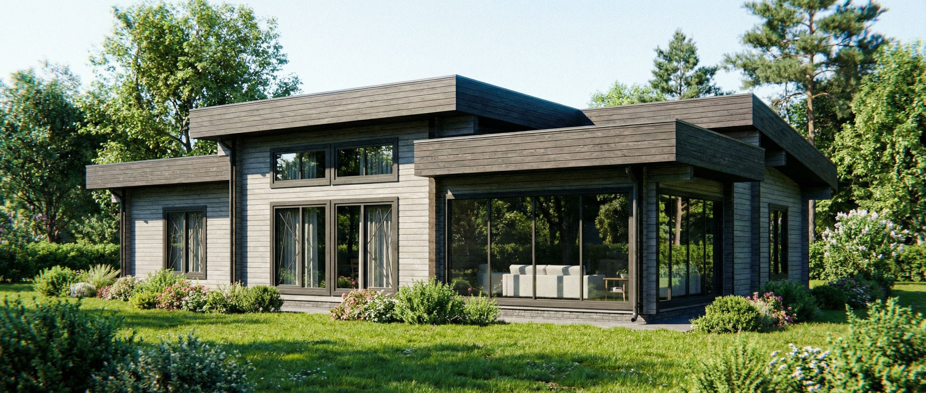 architectural visualization of a private house made of gray glued laminated timber with contrasting ends on a human scale, keep exact camera angle