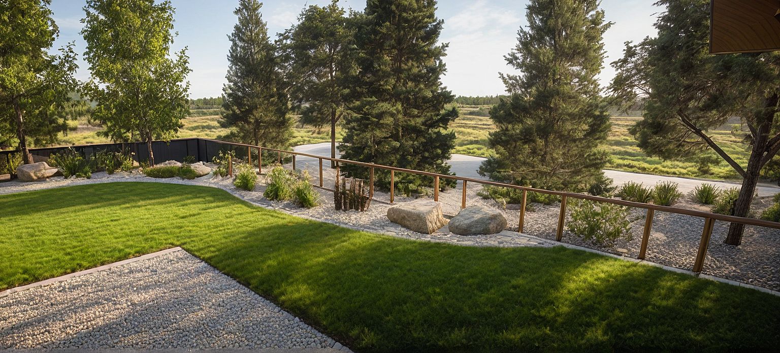 PromptPhoto of a landscaped outdoor space featuring a curved pathway bordered by lush greenery, including tall coniferous and flowering trees. The design incorporates natural materials like stone and gravel, creating a gently flowing terrain. The lighting is soft, suggesting mid-morning sun casting delicate shadows on the ground. Perspective captured from ground level to emphasize the textures of the plants and pathway, using a wide-angle lens to convey the openness and beauty of the natural surroundings.