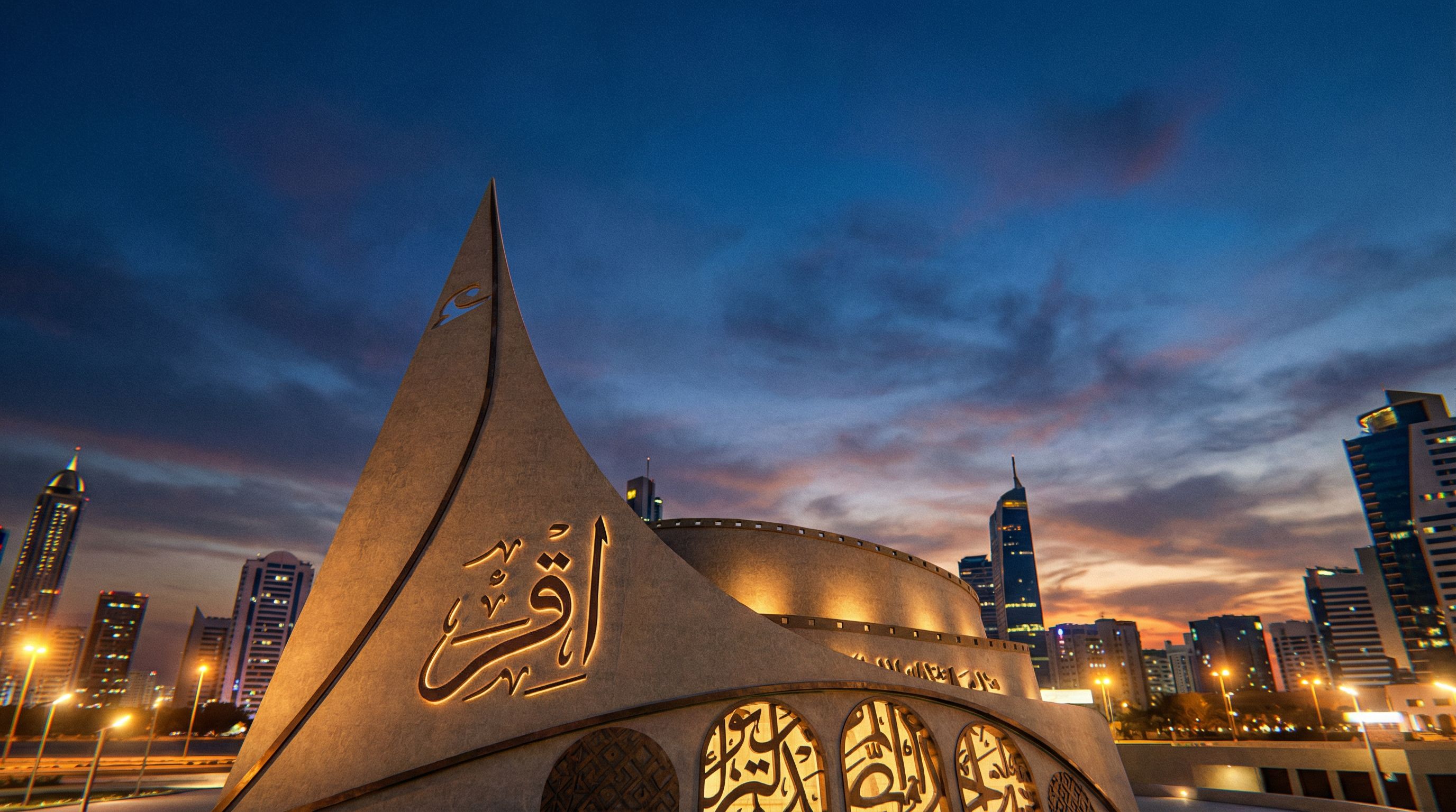 Photo of an innovative Islamic cultural center, showcasing a unique geometric design with a soaring pointed roof and intricate calligraphic details. Set against a vibrant urban skyline, Dramatic natural lighting illuminates the structure, accentuating textures and shadows. Captured from a low angle, with a wide lens to emphasize the height and form of the building, creating a dynamic and inspiring architectural visualization., keep exact camera angle