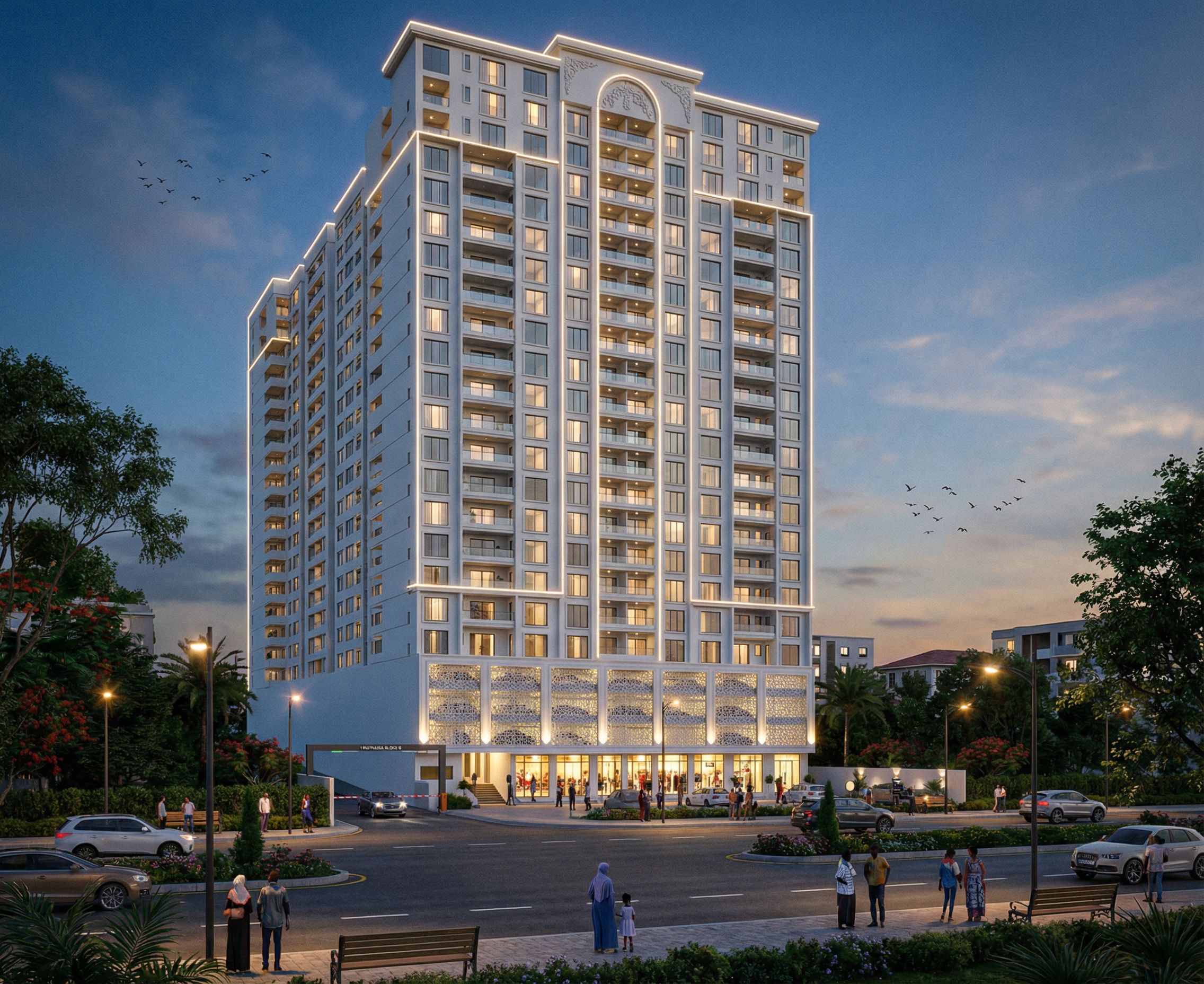 RENDER OF A BUILDING IN MUTHAIGA AREA IN KENYA. USE WHITE WALL MASTER ON THE BUILDING. MAKE THE GLASS CLEAR, TRANSPARENT AND REALISTIC. GROUND FLOOR IS COMMERCIAL WITH SHOPS AND ABOVE 3 LEVELS ARE PARKING LEVELS COVERED WITH ALUMINIUM LATTICE WORK . Use rope lights, spot lights and street lights on the building., keep exact camera angle. USE PEOPLE OF AFRICAN AND SOMALI ORIGIN IN THE IMAGE. MAKE IMAGE REALISTIC AND HIGH RESOLUTION OF 8K. WRITE "MUTHAIGA BLOCK B" ON THE BUILDING. VEHICULAR ENTRANCE IS ON THE LEFT RIGHT AFTER THE SHOPS BUT WITHIN THE BUILDING. SHOW THE WHOLE BUILDING TO THE TOP. INCLUDE SOME BIRDS IN THE SKY. MAINTAIN ORIGINAL CAMERA ANGLE AND SHOW BUILDING ALL THE WAY TO THE ROOF. INCLUDE THE ARCH IN ROOF IN THE ORIGINAL IMAGE AND PUT MOULDINGS AROUND OPENINGS AND WINDOWS., keep exact camera angle