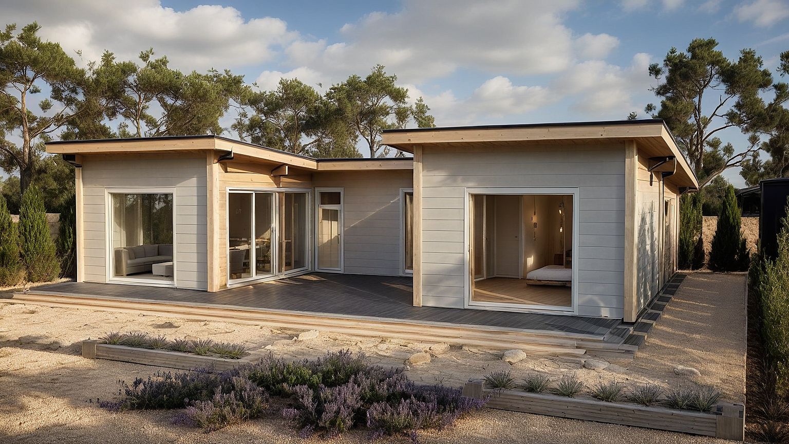 PromptA single-story Honka wooden house, transformed into a Mediterranean-inspired retreat. Keep the original structure and proportions, but adapt the exterior with light, warm-toned natural plaster walls in soft sand or terracotta shades, wooden beams with a sun-bleached finish, and keep black roof. Replace the dark deck with light wooden terrace flooring. Add green Mediterranean landscaping: rosemary, lavender, olive trees, and cypress trees in the background. The setting should reflect late afternoon golden sunlight, with a calm, coastal southern European atmosphere. Large glass sliding doors remain, allowing a seamless indoor-outdoor transition. A hint of rustic charm and natural textures, with soft shadows and warm tones throughout
