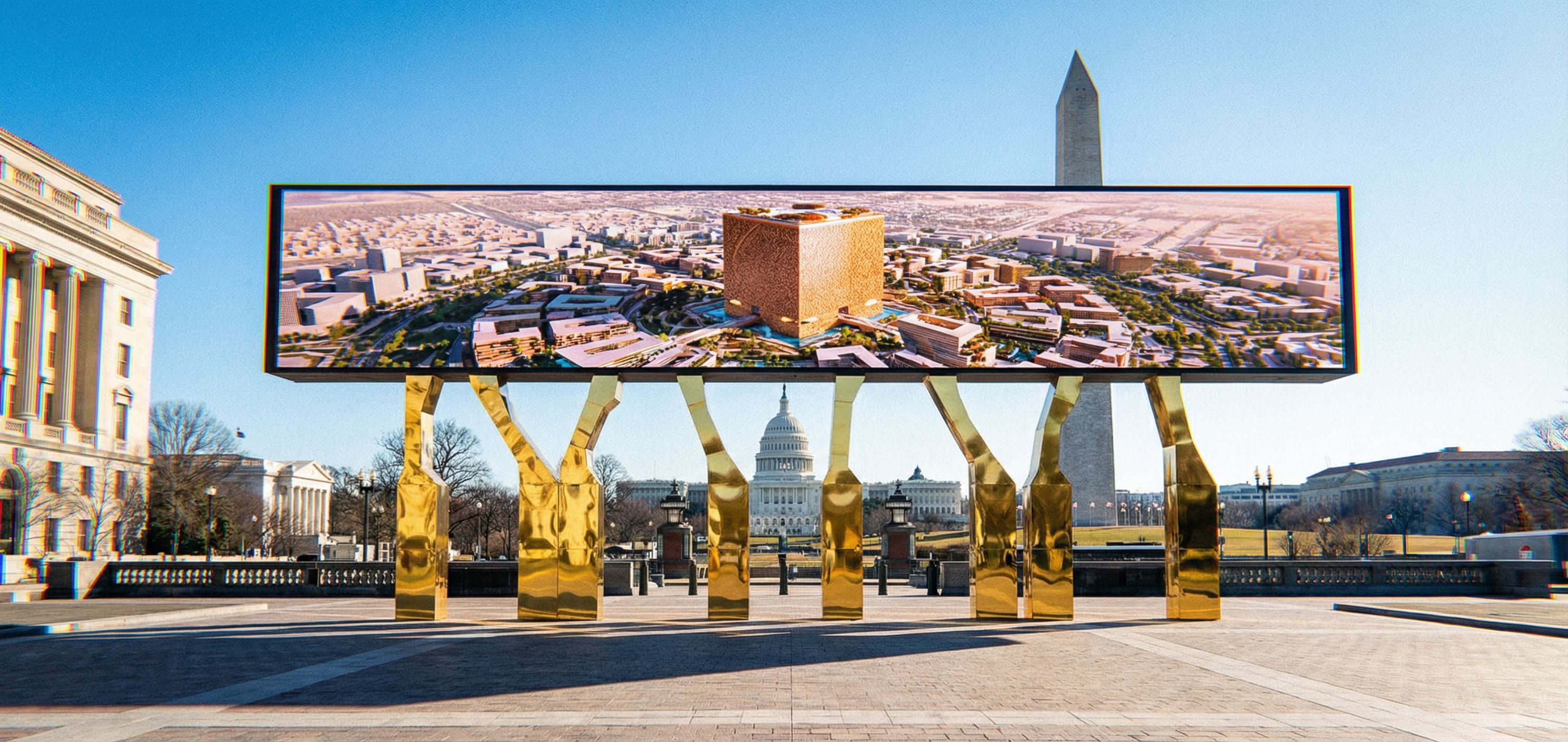 Promptkeep exact camera angle , BLACK IS SCREEN , YELLOW IS GOLD CLADDING , , Washington DC , PUT New Murabba PROJECT ON SCREEN,, keep exact camera angle