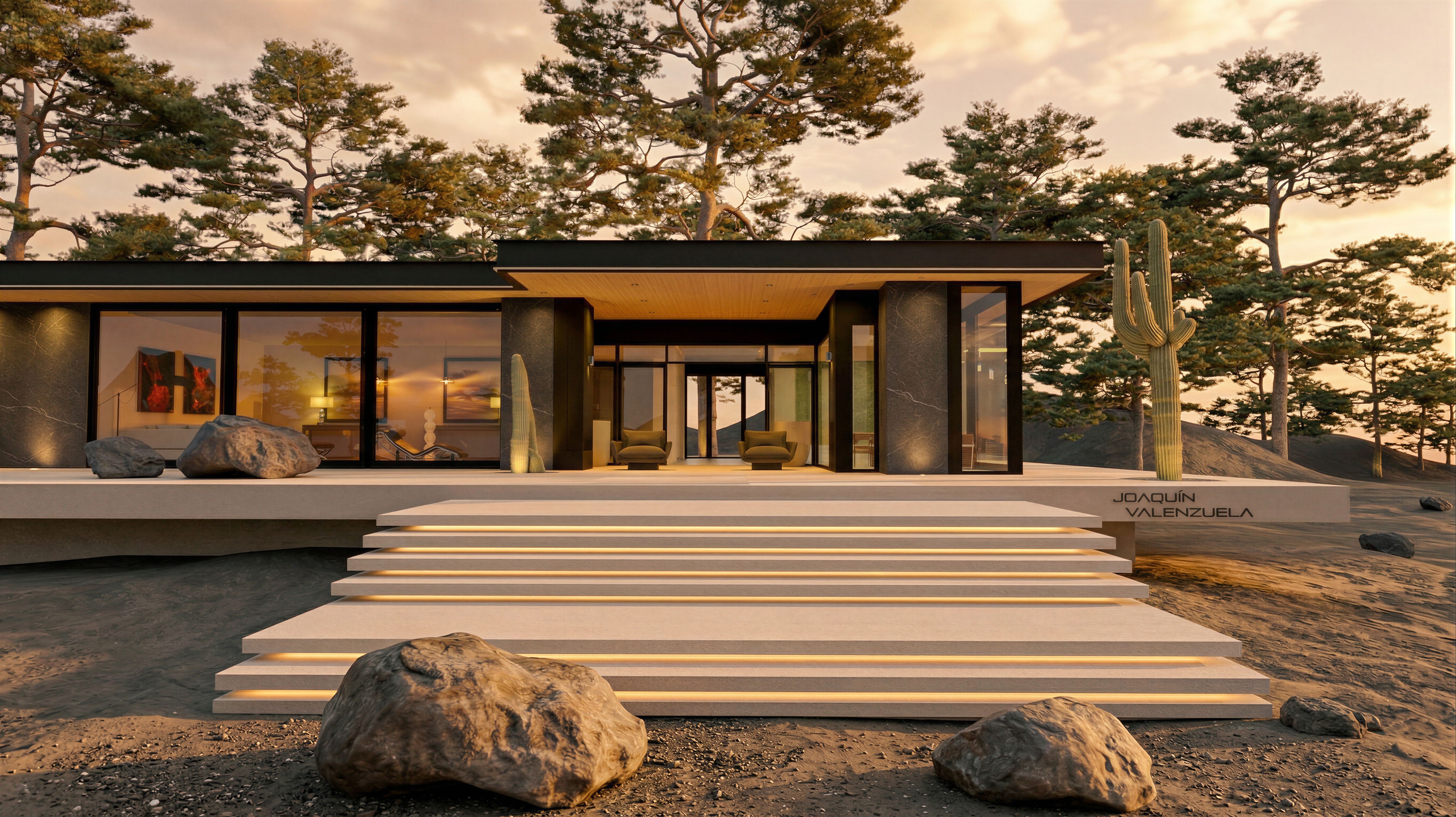 Respeta la arquitectura y el diseño y formato de esta imagen y realiza solamente los siguientes cambios: Añade más detalle, definición y realismo a esta imagen. Añade ligeramente más intensidad a las luces de la escalera. Mejora la calidad de la imagen en las palabras Joaquín Valenzuela que está en el murete de la derecha. Cambia el material de piedra de la paredes por el de la imagen de referencia., keep exact camera angle