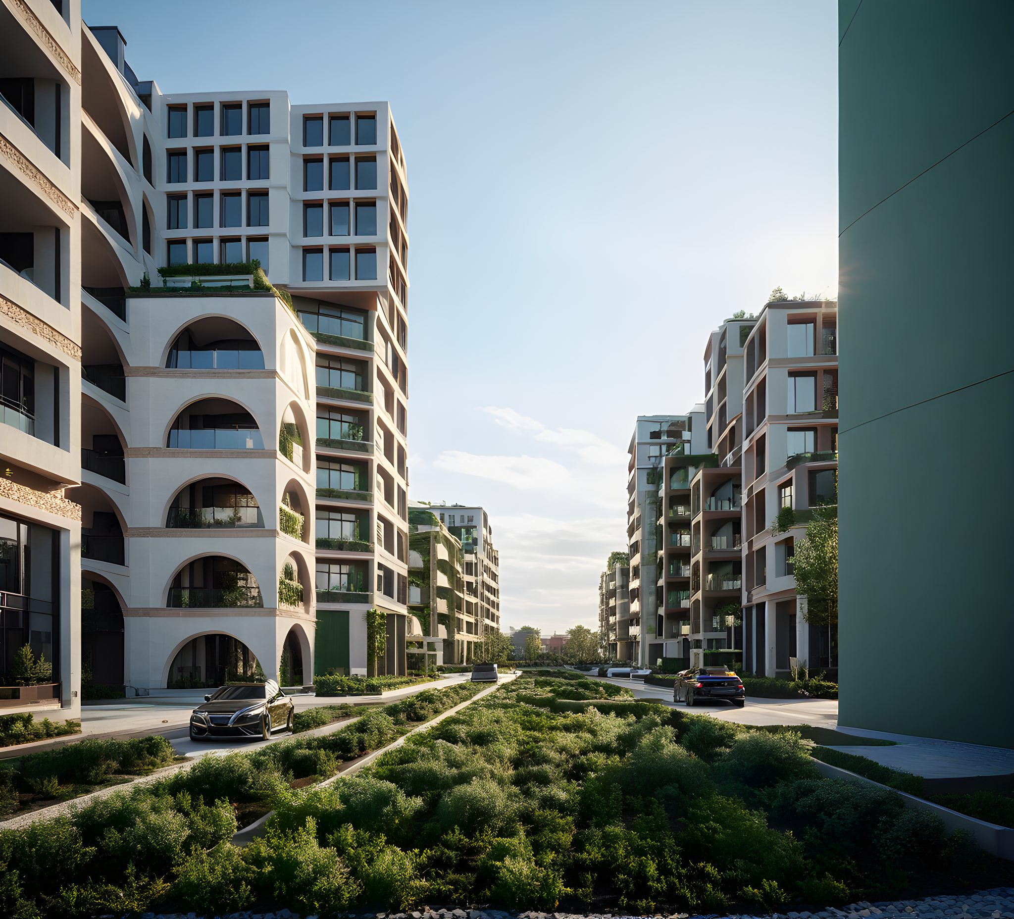 PromptLUXURY ARCHITECTURE. LUXURY APARTMENTS, DAY LIGHT, STREET, COLOR PLASTER FACADE MATERIAL, GREEN ROOF TOP