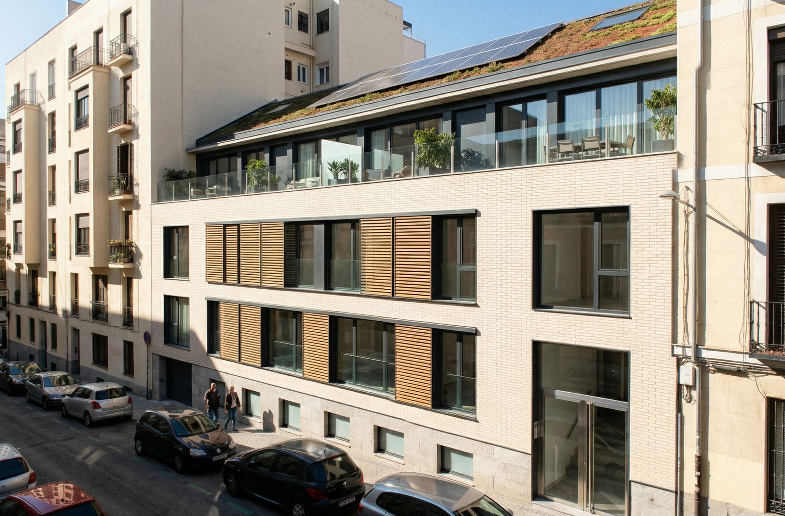The top floor MUST be visibly stepped back 3 meters from the main facade plane. This creates an exposed terrace/balcony running the full width of the building. The step-back should cast a clear shadow on the terrace floor. This is the most important architectural feature — make it obvious. Look carefully at the uploaded photo. This is the CURRENT back facade of a property at Fernández de los Ríos 59, Madrid, seen from Abdón Terradas street. The low building with graffiti is an old industrial warehouse former cinema that will be COMPLETELY DEMOLISHED and replaced with a new residential building. The tall building visible BEHIND the warehouse is the existing residential tower 22.55m, 5 floors + attic — that tower STAYS and is being renovated. You can see it rising above the warehouse. It must remain visible in the render, behind and above the new building. I need a photorealistic render showing the NEW BUILDING that replaces the warehouse, as seen from Abdón Terradas street. THE NEW BUILDING EDIFICIO 2 — WHAT TO SHOW: Height: 13.5 meters total, 4 floors above ground. Significantly LOWER than the tower behind it the tower is 22.55m, almost twice as tall. The tower must be visible rising above. Width: 18 meters same as the current warehouse, wall to wall between neighboring buildings. SEMI-BASEMENT LEVEL partially below street level, about -0.50m: - Small windows at ankle height along the street facade — these are high windows for studio apartments below. - The windows are horizontal format, about 0.5m tall, with frosted or translucent glass for privacy. - There are 6 of these windows evenly spaced along the facade. GROUND FLOOR street level: - A residential entrance door on the right side: glass + dark metal frame, minimal and elegant. - The rest of the ground floor facade has regular windows for apartments inside. - No commercial spaces — this is purely residential. FLOORS 1 AND 2: - Regular residential floors with generous windows. - Balconies with dark metal railings and some potted plants. - The facade rhythm is clean and modern but not cold. FLOOR 3 TOP FLOOR — KEY FEATURE: - This floor is SET BACK 3 METERS from the main facade line, creating a row of TERRACES in front of it. - The terraces have glass railings, outdoor furniture hints, and planting. - This setback is clearly visible as a step-back in the building volume — it is the most distinctive feature of this facade. - Behind the setback, the top floor has floor-to-ceiling windows. ROOF visible above the setback: - Partially green roof sedum/plants and partially solar panels. - A small communal terrace area. FACADE MATERIALS AND STYLE: - NOT a copy of the old tower. This is a clearly CONTEMPORARY building, but warm and contextual with Madrid. - Main material: light-toned brick cream/sand color — different from the tower's darker brick, creating a dialogue but not imitation. - Horizontal WOOD SLATS as sun protection on the south-facing windows this facade faces south, so solar protection is important. The slats are natural wood tone, horizontal, fixed. - Window frames: dark anthracite aluminum, large format. - Ground floor: natural stone base limestone or similar for the first 1.5 meters. - The overall feeling is: warm, modern, high-quality residential. Think contemporary Madrid architecture — firms like MVRDV, Burgos & Garrido, or Rafael de la Hoz. THE TOWER BEHIND: - The existing tower is visible rising above the new building. Show approximately 2-3 floors of the tower above the new building's roof line. - The tower's rear facade is simpler than its street facade: rendered/plastered in light color, with regular windows. Show it renovated and clean. - This height contrast tall tower + lower new building is architecturally intentional and must be clearly visible. NEIGHBORING BUILDINGS: - On both sides: typical Madrid residential buildings, 4-6 floors, rendered facades, some with small balconies. The new building fits in height and character with these neighbors. STREET — ABDÓN TERRADAS: - Narrow one-way street, typical Madrid secondary street. - Parked cars along one side. - Narrow sidewalks with stone curbs. - A couple of pedestrians. VIEWPOINT: - Standing on the opposite sidewalk, looking at the full facade. - Slight 3/4 angle from the RIGHT side, to show the depth of the setback on the top floor. - Eye height 1.6m. Distance approximately 10-12 meters from facade. LIGHTING: - Morning light this facade faces SOUTH, so it gets direct sun most of the day. - Bright, clear Madrid sky. Strong light with defined shadows that reveal the setback volume. - The wood slats cast interesting shadow patterns on the facade. IMAGE QUALITY: - Photorealistic architectural visualization. - Real material textures: brick joints, wood grain on slats, metal reflections, glass. - High-end real estate marketing quality. - Editorial architectural photography style. CRITICAL REMINDERS: - The new building is 13.5m 4 floors. The tower behind is 22.55m visible above. Show this height difference clearly. - The top floor setback of 3 meters is the KEY design feature of this facade. Make it prominent. - The semi-basement windows at ground level are small and horizontal — they hint at the studios with private gardens on the courtyard side. - This is NOT a glass tower or a generic modern building. It is warm brick + wood, Mediterranean-contemporary. , keep exact camera angle