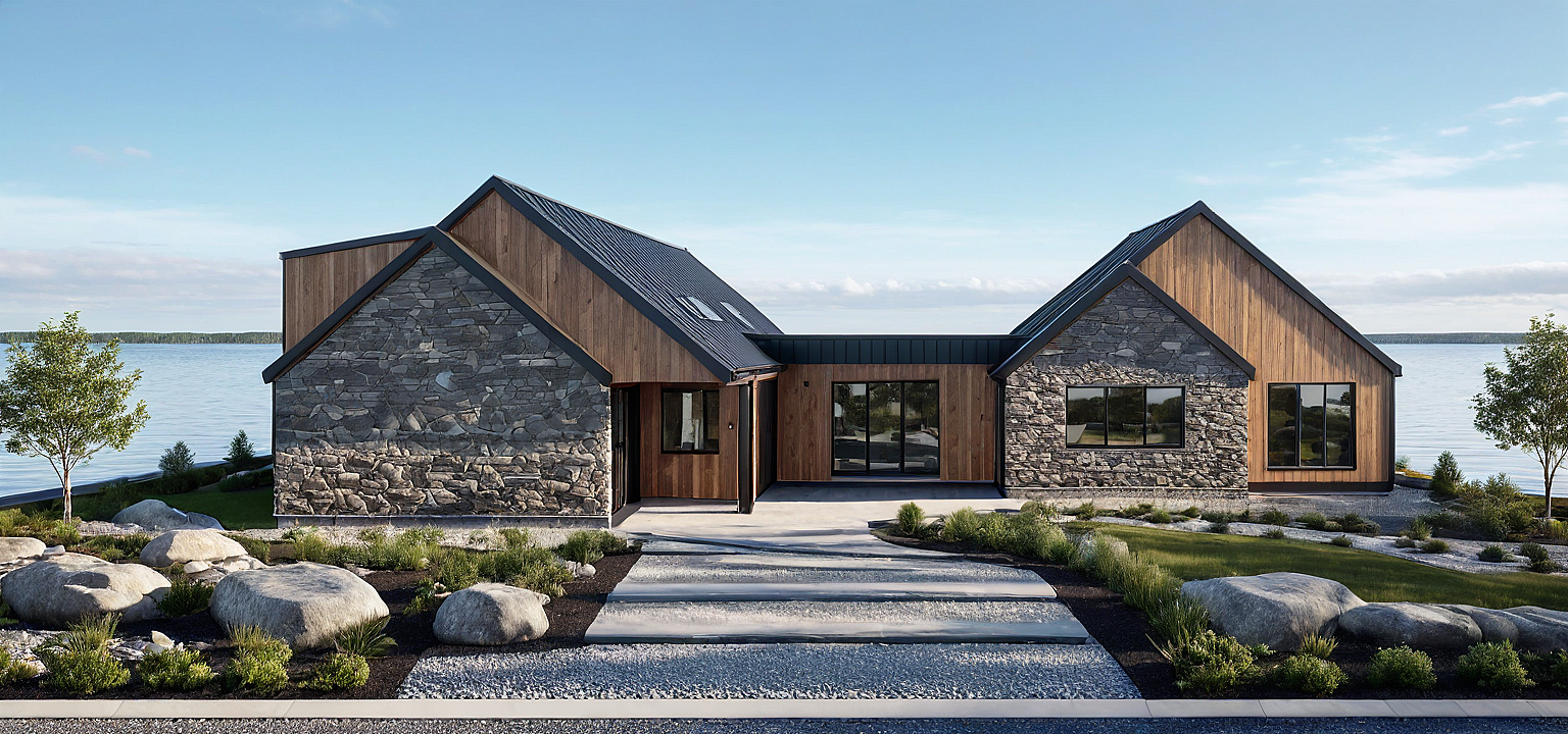 PromptModern Scandinavian Style, with modern landscaping, stone accents, steel roof, wood walls, driveway left, water background