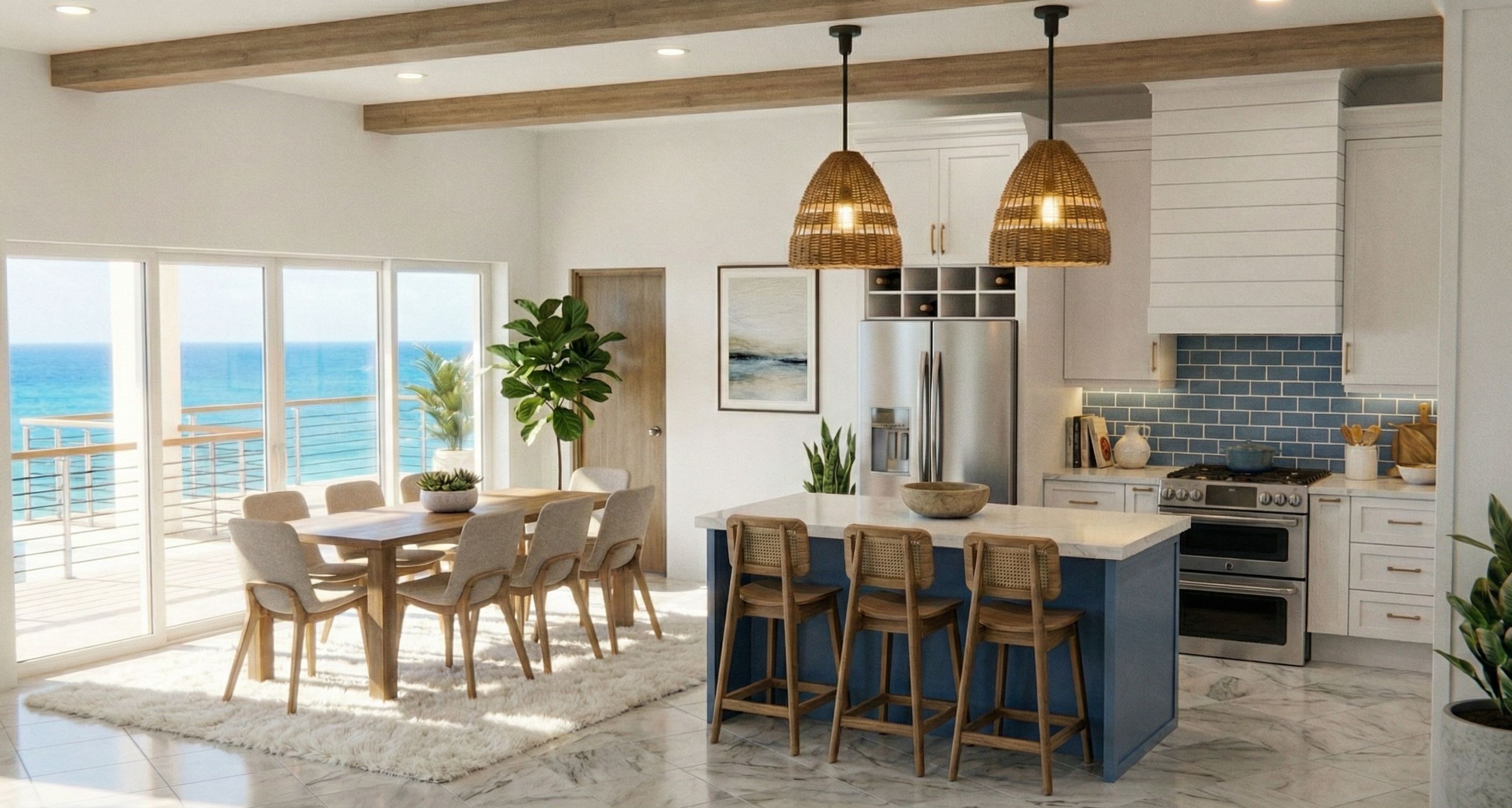 Promptchange the range hood to ship lap, add a white wool rug under the dining table, blue subway tile backsplash , keep exact camera angle