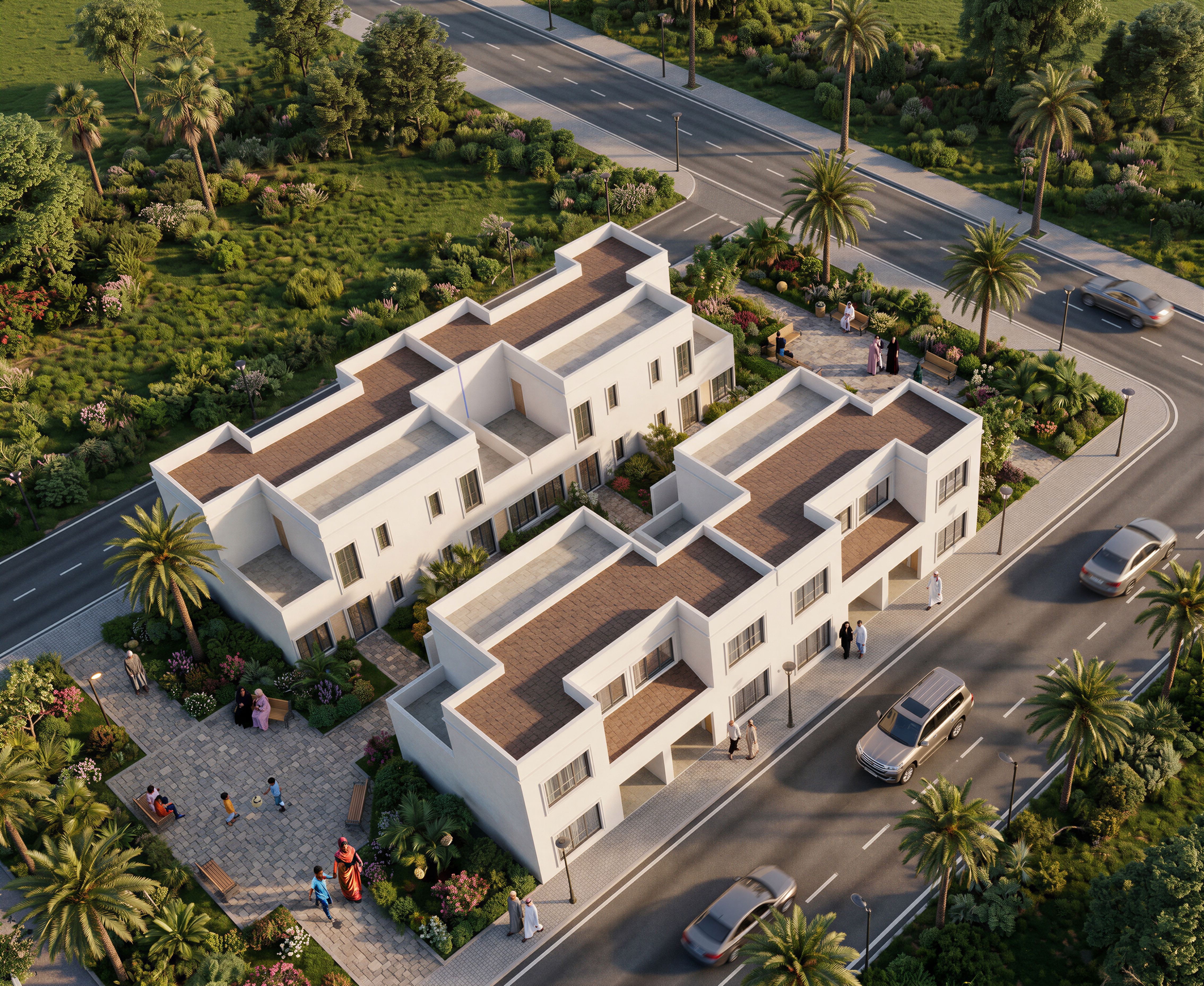 EnhancedPromptIMAGE OF UNITS WITH A MIDDLE GREEN COURT WITH LANDSCAPING. USE MOULDINGS AROUND OPENINGS AND WINDOWS. MAKE GLASS REFLECTIVE AND REALISTIC. INCLUDE PEOPLE AND CHILDREN OF SOMALI ORIGIN IN THE IMAGE. USE WHITE WALL MASTER ON THE BUILDING. INCLUDE SOME STREET LIGHTS. USE PALM TREES IN THE DESIGN. MAKE IMAGE HIGH RESOLUTION 8K. maintain the decra roof. maintain original design . remove balcony and grass on the roof., keep exact camera angle