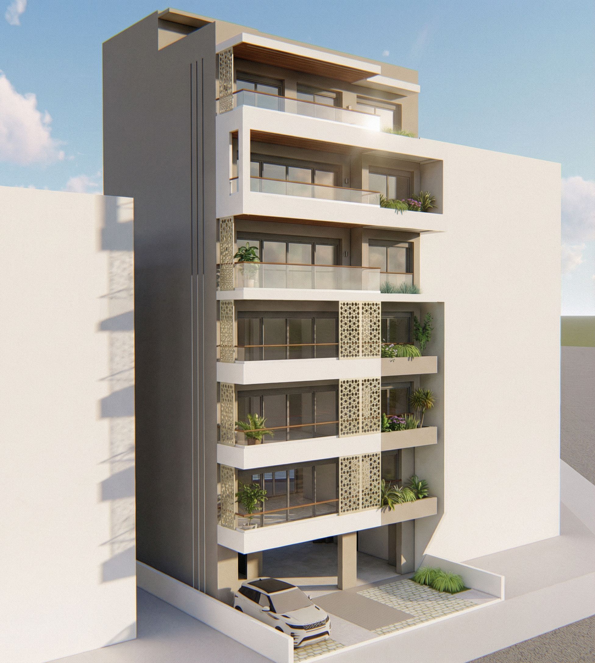 PromptPhoto of a modern apartment building featuring sleek lines and contemporary balconies. Emphasize , expansive glass windows, and wooden tops of balcony accents. Capture natural sunlight enhancing the architectural details, with soft shadows cast by the balconies. Basic color ral 7006 and some beige details with white balconies. Dont change the building. No trees from the left side of building, keep exact camera angle