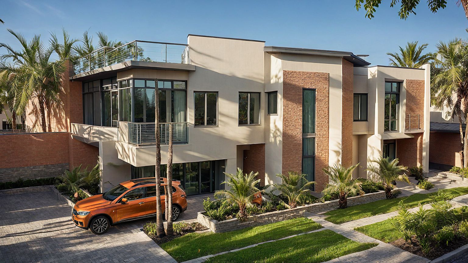 PromptPhoto of a modern two-story residential building featuring a blend of green and earthy tones, with textures of stone and brick. Surrounded by palm trees and a manicured garden, the structure includes large windows and a rooftop terrace. Soft afternoon sunlight casts dynamic shadows, enhancing the architectural details. Captured from a low angle, emphasizing the height and design, with a wide lens to encompass the surroundings and the parked orange car in the foreground. exterior wall lights, windows curtains