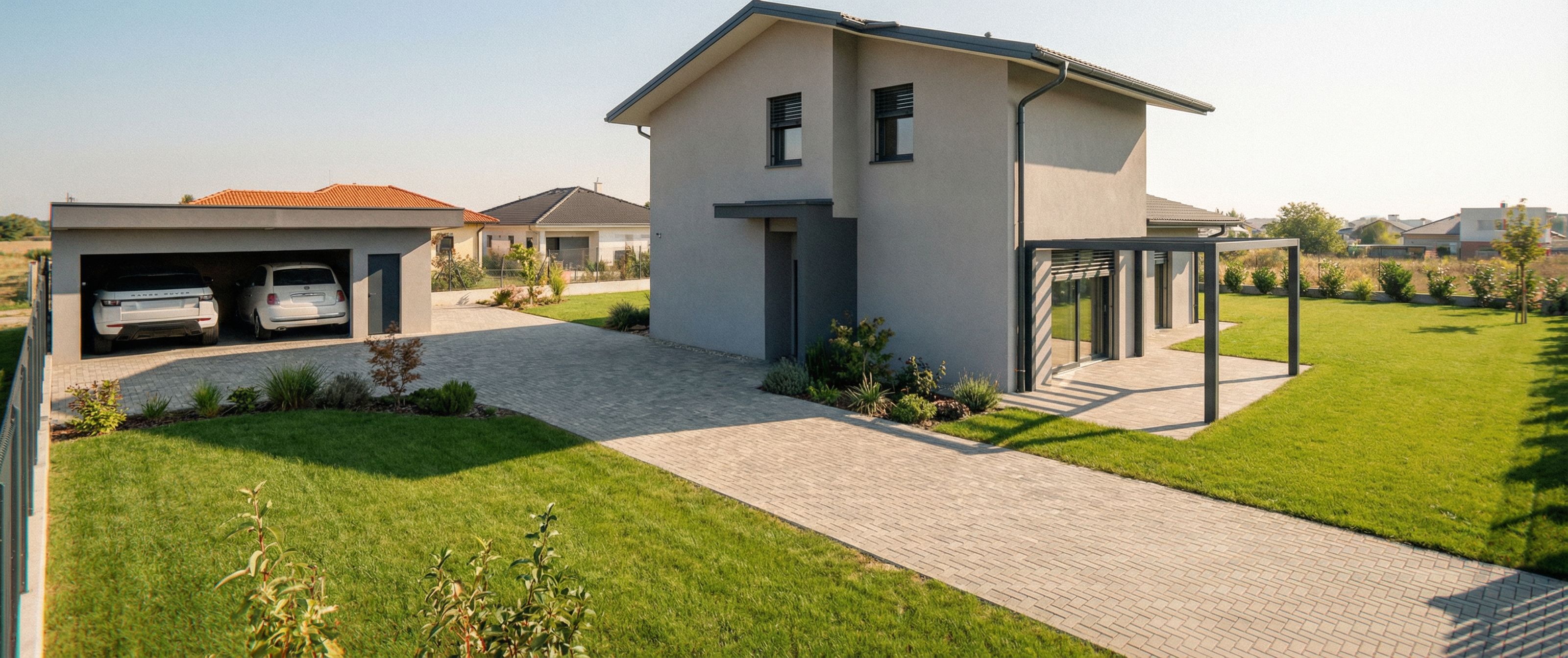 PromptGenerate with dove-gray walls, charcoal-colored windows and shutters. Anthracite-colored guttering and downspouts. Add a green lawn and small plants. , keep exact camera angle