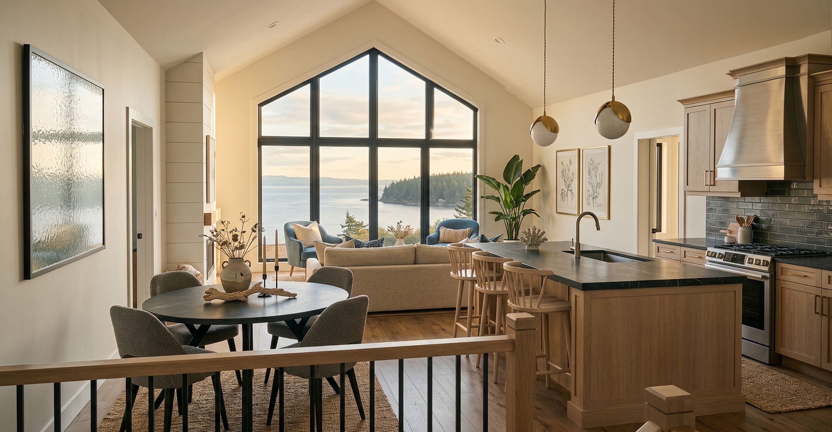 PromptPhoto of a modern open-concept living space, featuring a spacious living room with a large, vaulted ceiling and expansive windows that offer vibrant natural light. Emphasize the juxtaposition of warm wood textures against sleek cabinetry and stainless steel appliances in the kitchen area. Include stylish furniture elements like a round dining table and comfortable sofas. The scene is set in a cozy, inviting atmosphere during the afternoon light, casting soft shadows. Captured from a slightly elevated angle with a wide lens to encompass the entire flow of the layout, highlighting its harmonious design. Hints of coastal decor and blue hues., keep exact camera angle