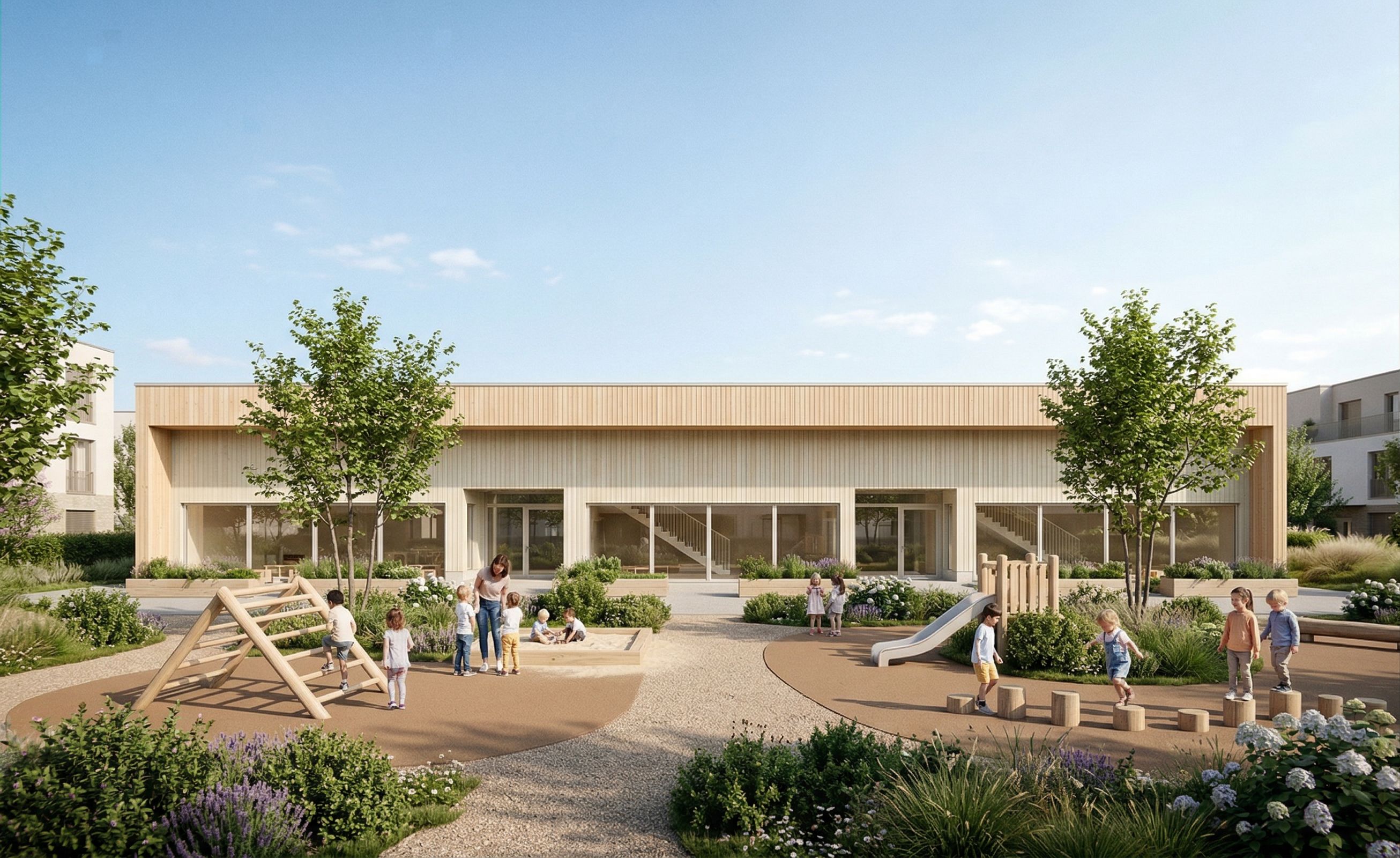 Promptthis building is a kindergarden, please, add children, playground, nice greenery. The fasade is wooden planks. Try to combine 2-3 nice, calm, light colours.
