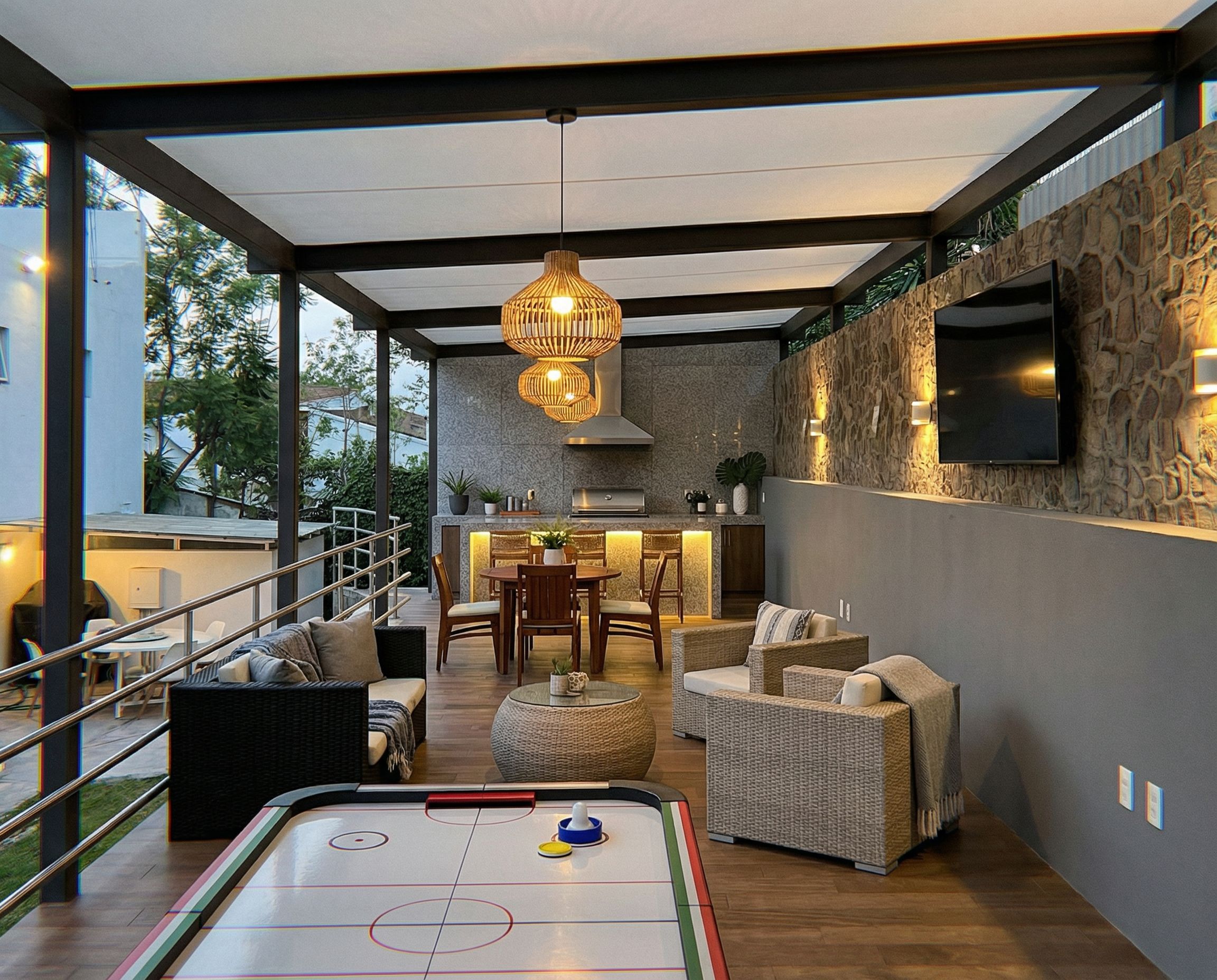 Promptfoto de una terraza abierta del lado izquierdo y de lado derecho tenemos un muro de piedra con un recubrimiento a la mitad de abajo hacia arriba de muro solido de color gris y contactos electricos en la parte baja , se coloca una pantalla de tv en el muro de piedra, al fondo contamos con un muro con recubrimiento de granito gris ,con una barra y una contrabarra hacia atras con una campana de extraccion de un azador , adelante de la barra una mesa con cuatro sillas, y depues una sala , y en primer plano una mesa de aire de juego , el piso sera de madera en acomodo horizontal , el techo sera con cubierta ligera de color blanco con soportes metalicos y columnas metalicas , lamparas colgantes como la imagen original, esta terraza se coloca en la imagen de referencia, desde el fondo hacia adelante , y abarca donde esta marcado el area en blanco respetando lo que existe del lado izquierdo