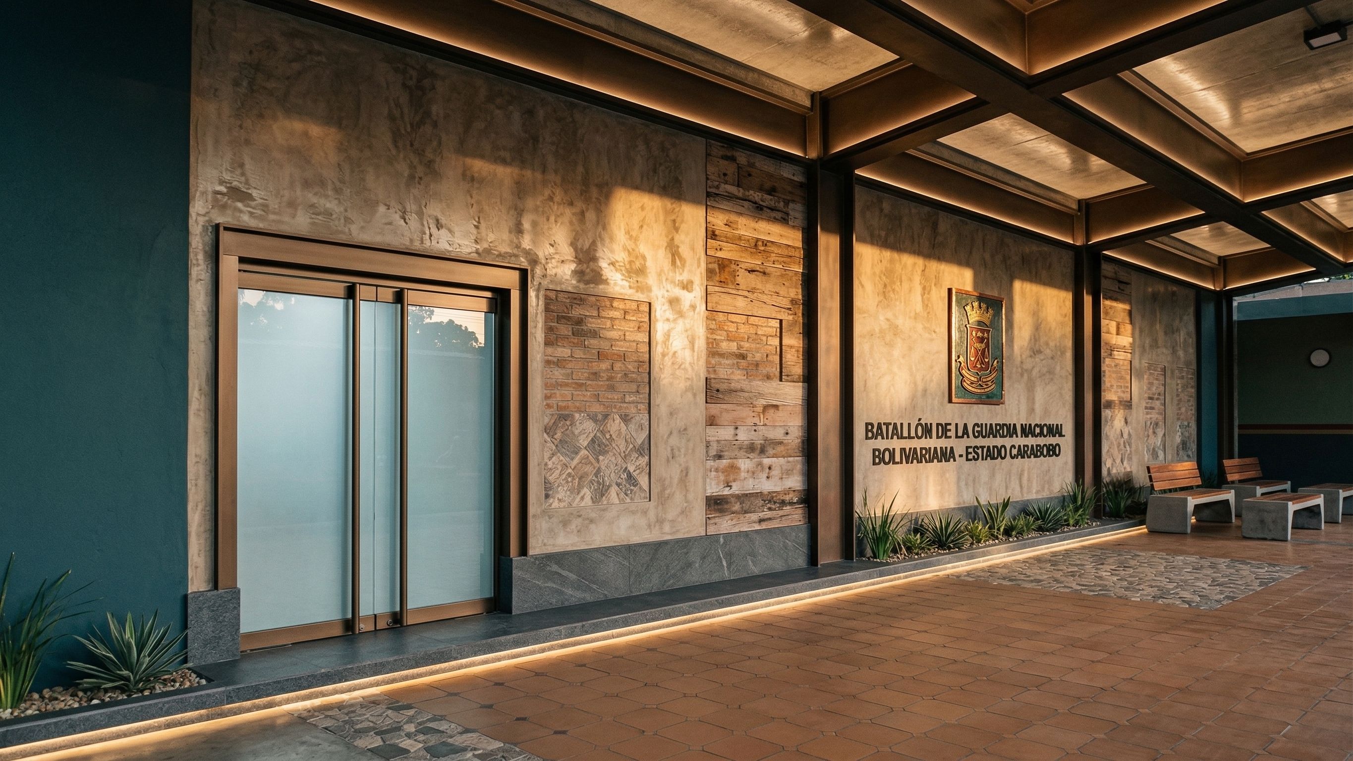 Ayúdame a hacer una fachada bonita con revestimientos rústicos como de microcemento para este batallón de la guardia nacional de Venezuela en el estado Carabobo , keep exact camera angle