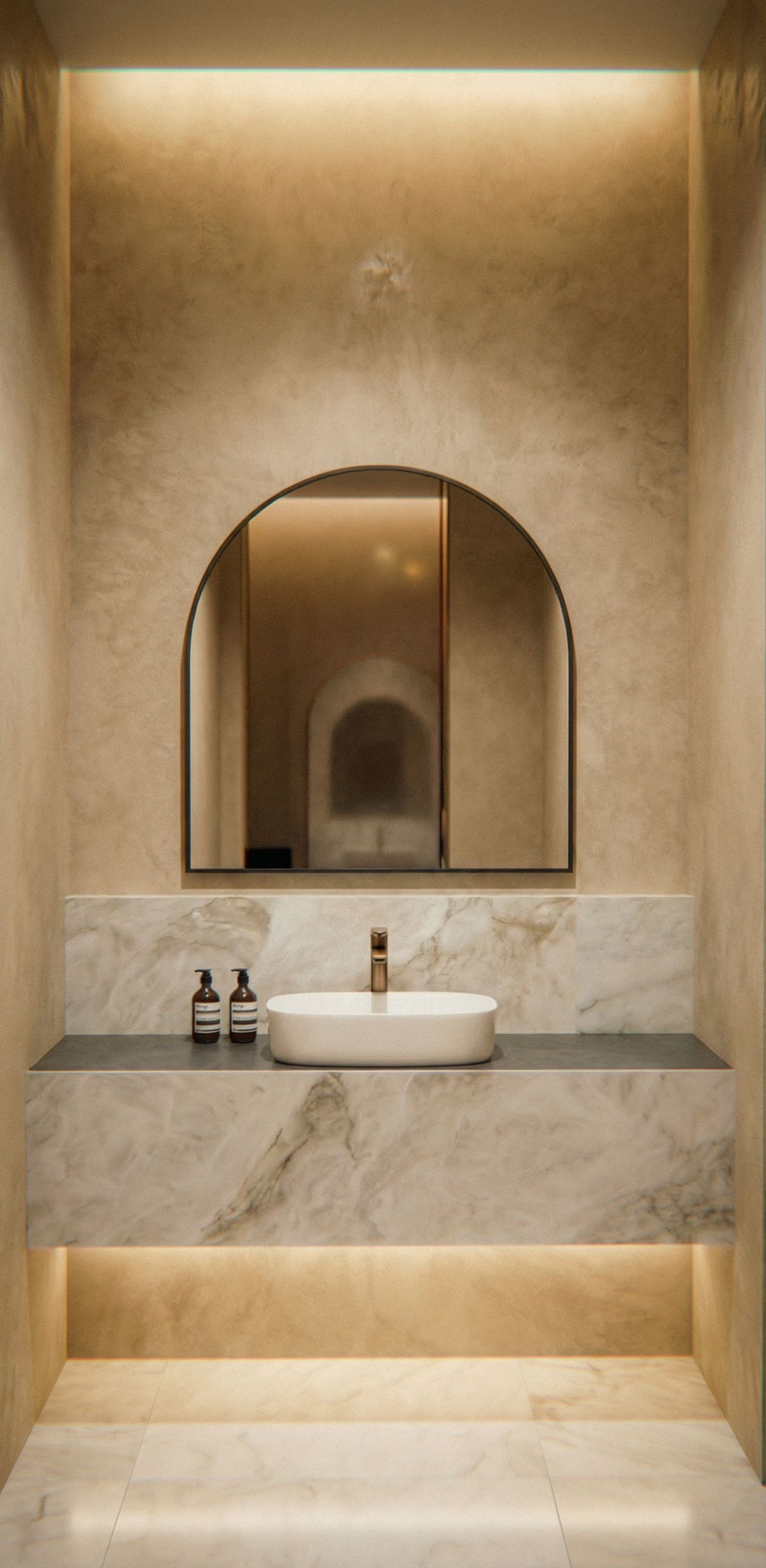 Promptbrushed bronze tap. change walls to light venetian plaster, keep exact camera angle