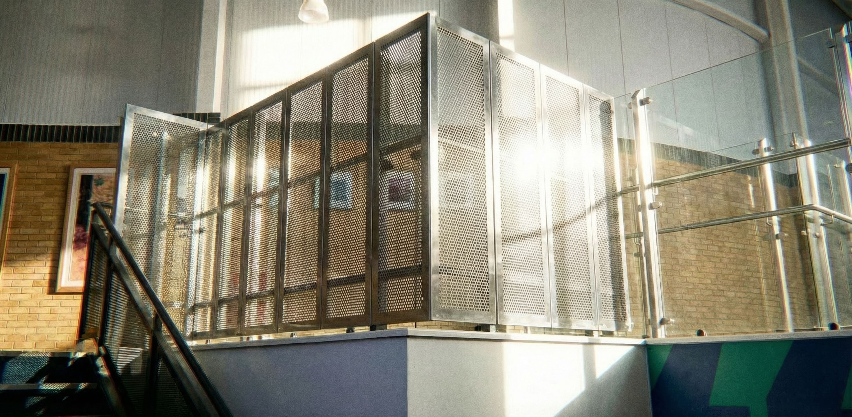 Promptrender the photograph to show perforated metal panels finished in stainless steel on front of the existing glass balustrade as shown in the reference sketch. The perforated as shown in the second reference photo panels should be as tall as the glass balustrade. There are three runs of panel, a panel adjacent to the first tread, which is a small panel a second long panel at 90 degrees to it and a third panel 90 degrees to that. They should meet at the intersection so there are no gaps it is a sunny day and the sunshine is streaming in through a window behind the viewer. , keep exact camera angle
