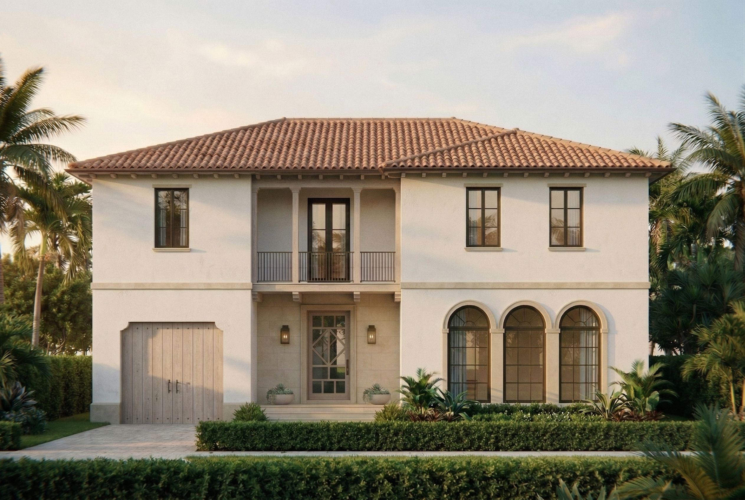 Enhance this image to be ultra-photorealistic while keeping the architecture EXACTLY the same. Do NOT change, move, add, or remove anything. Do NOT alter massing, proportions, openings, rooflines, railings, landscaping layout, or camera view. Do NOT crop or zoom. This is a strict material and lighting enhancement only. MATERIALS: Wood garage door + balcony: lime-washed pecky cypress soft, neutral, slightly desaturated tone VERY SUBTLE grain — barely visible, refined and understated minimal contrast in the wood texture no heavy knots or rustic variation smooth, matte, high-end finish slight tonal variation only, not patchy or busy absolutely NO orange tones Cast stone ALL surrounds, arches, horizontal band, trim, AND front door panel surround: must clearly read as cast stone, not stucco smooth, dense, honed limestone-like finish slightly different tone than stucco subtle but clearly distinct crisp edges and clean reveals minimal joints, very refined subtle edge shadowing to reinforce depth Front door panel reveal CRITICAL: must read as a solid cast stone panel system slightly richer tone and smoother than stucco clean edges with subtle shadow lines to define it Stucco main body: smooth, warm off-white slightly more porous than cast stone very subtle variation, not flat but not textured LIGHTING + DEPTH CRITICAL: Use soft directional daylight NOT flat, NOT overcast, NOT golden hour façade should be bright and elegant but NOT flat maintain clear, natural shadow definition: under roof overhangs and rafters within window and door recesses at the front door panel reveal along balcony structure and columns inside arch depths with soft gradient shadows increase ambient occlusion at all edges and transitions shadows should be soft but present — enough to create depth and dimension REALISM: matte stucco, smooth cast stone, refined wood not rustic no exaggerated textures or artificial finishes glass with soft reflections, interior slightly dark and indistinct GOAL: A high-end, refined, photorealistic render with quiet, elegant materials — especially a subtle lime-washed wood finish and clearly defined cast stone — with strong depth and shadow, while preserving the exact original architecture with zero changes., keep exact camera angle