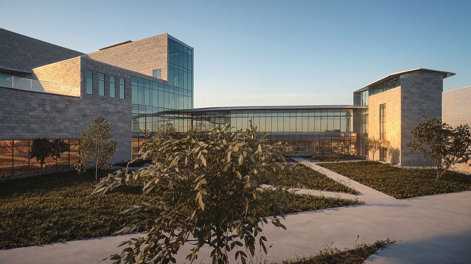 Promptsunset, warm, seats, modern hospital, entourage, concrete stone, clear glass, metal panels.