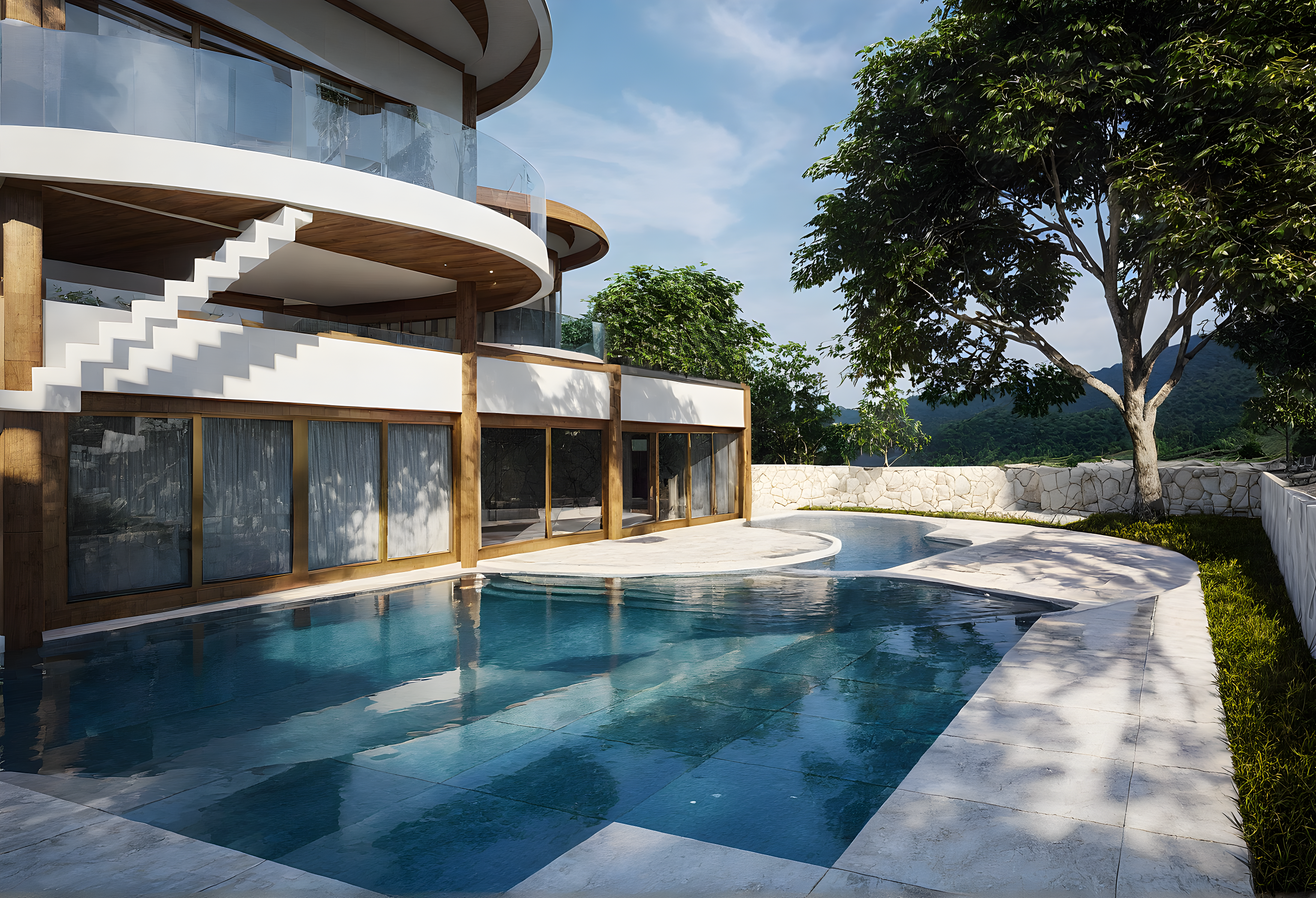 there are forest mountain background this pool villa is luxury style make this pic warmer render realistic render same color and material only the roof is deep blue color on the left is water fall in swimming pool the window frame is gold color make frame window be gold color background is only tree and mountain floor do not change material wall that white color make it be white color