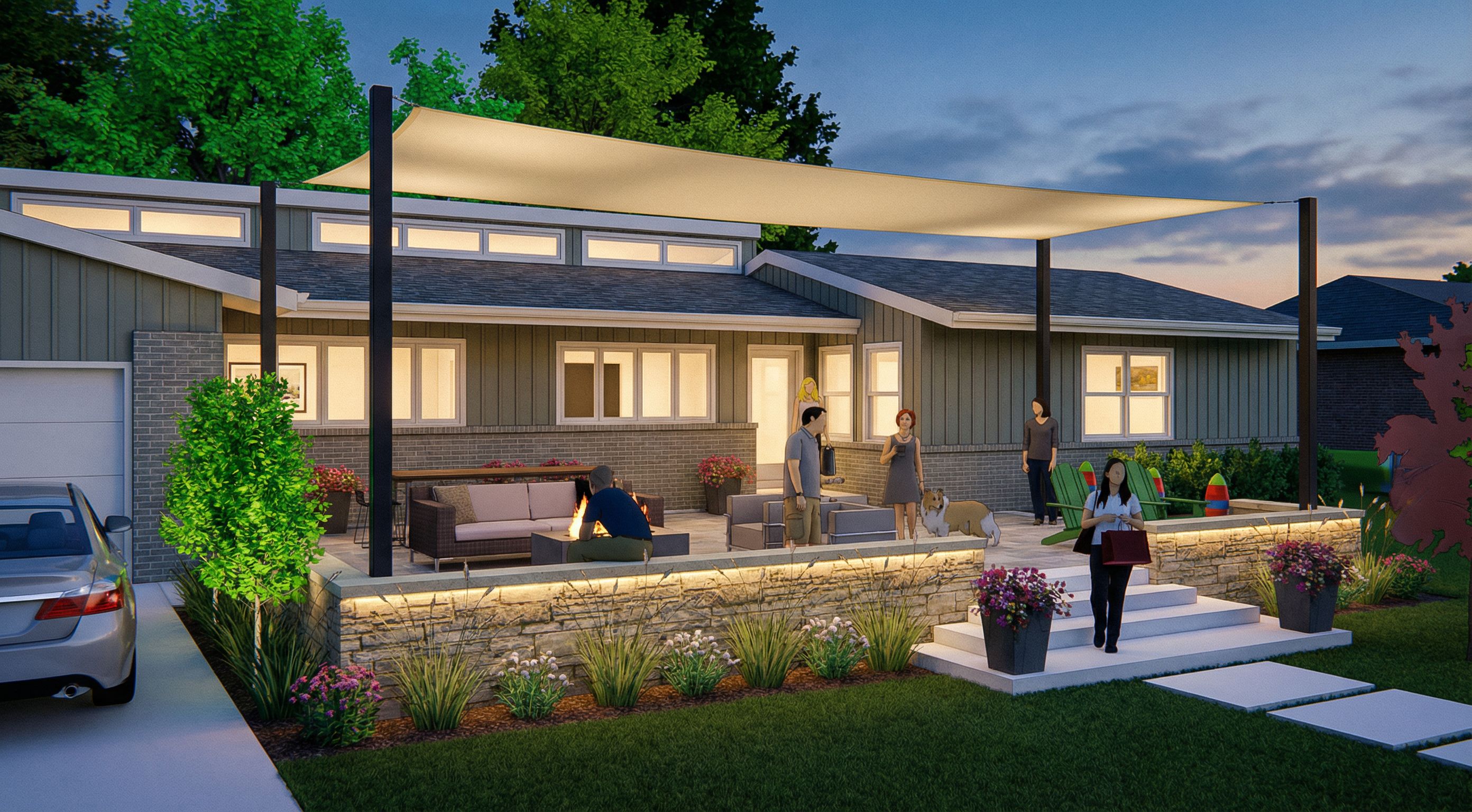 PromptPhoto of a modern residential home featuring sleek lines and a combination of horizontal lap siding gray green materials. The landscaped front yard is adorned with vibrant green trees and manicured greenery, creating a welcoming atmosphere. Afternoon sunlight casts soft shadows across the white pathway, enhancing the textures of the building's facade. Captured from a low angle to emphasize the structure's height and modern design, the scene reveals people enjoying the outdoor space, adding life to the urban setting. The center of the design is a shade sail , keep exact camera angle