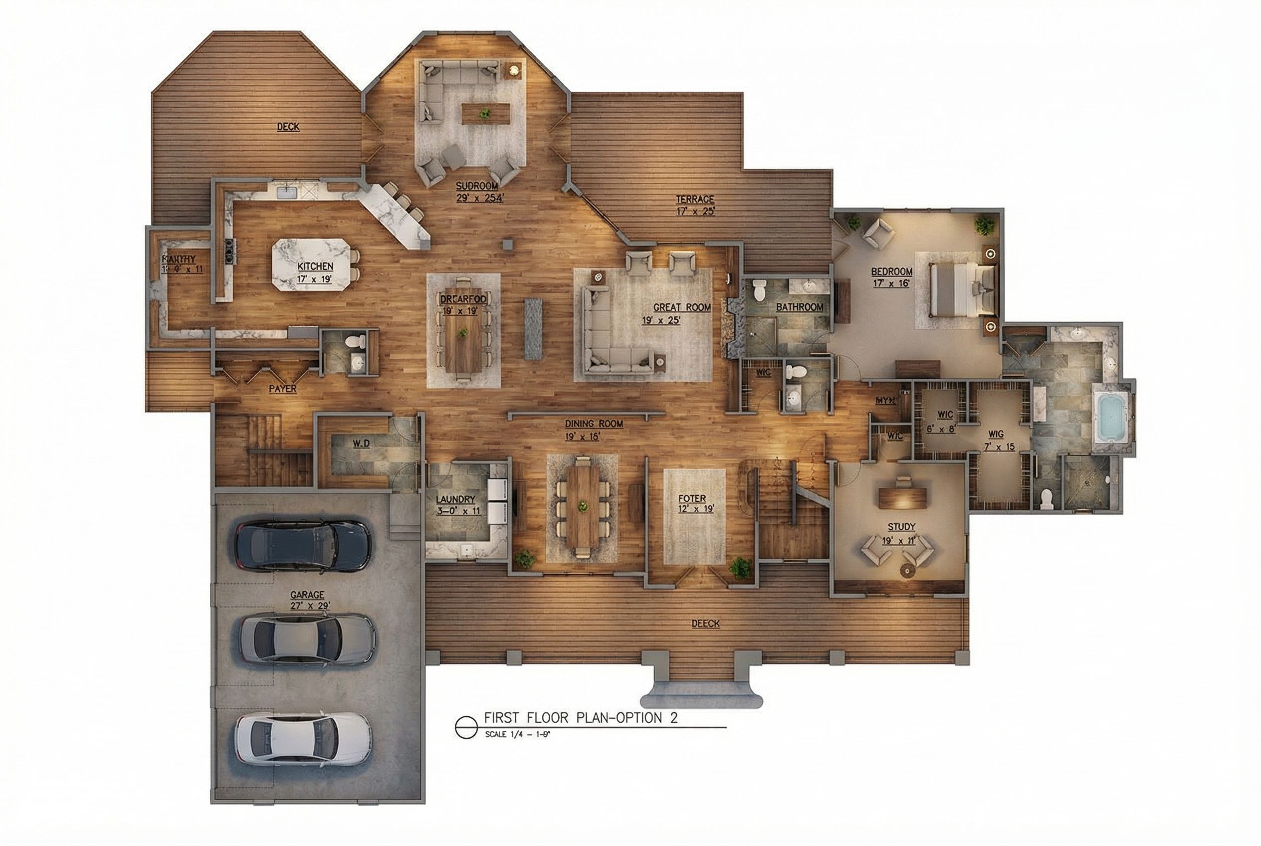 architectural floor plan, render this wireframe into photorealistic rendering, render the plan with furniture and room names. , keep exact camera angle, including furniture, dimension annotations, material indicators, high quality, professional, detailed scene