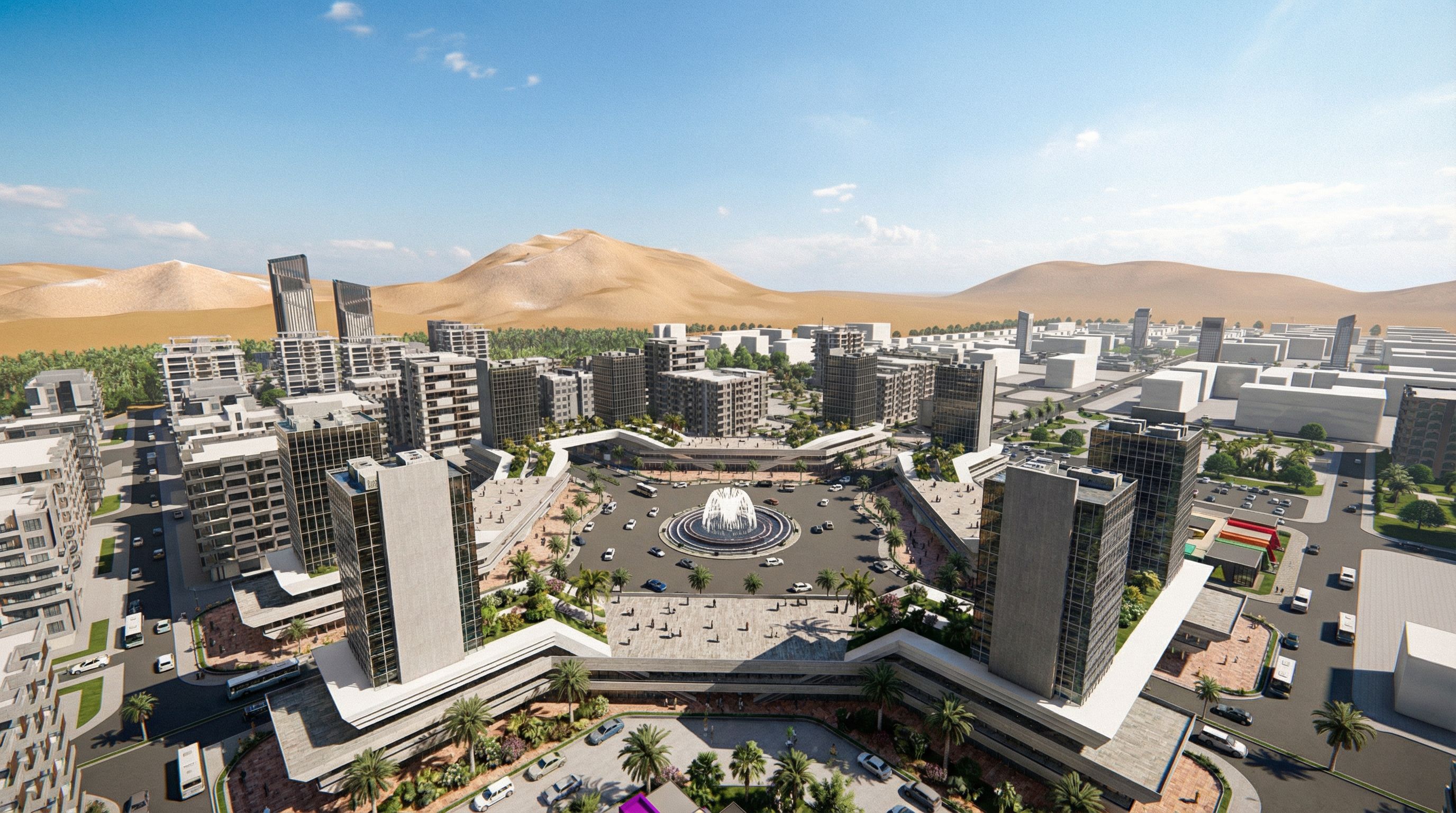 Photo of a modern urban complex set in a desert landscape, featuring sleek high-rise buildings with glass facades and textured concrete. The circular plaza with a central fountain is surrounded by lush greenery and palm trees, providing an inviting space. Bright daylight casts dynamic shadows, enhancing the architectural details. Captured from a high-angle perspective, the scene conveys a sense of openness with distant mountains framing the backdrop. Use a wide-angle lens to emphasize the scale and depth of the environment, creating a vibrant and lively atmosphere., keep exact camera angle