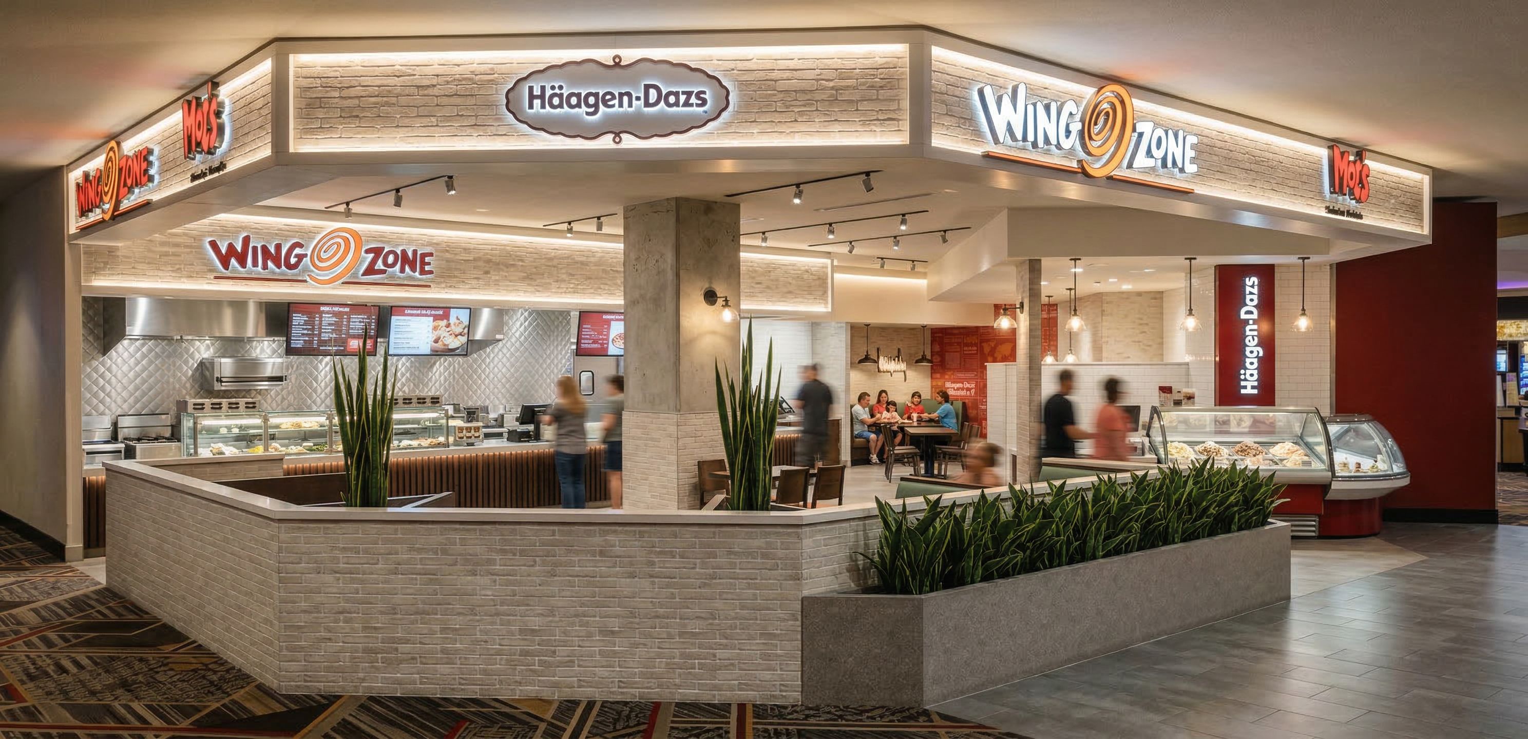 The is a bright and airy food court inside the excalbiur hotel in las vegas. Wood and concrete accents. Indirect ligthing, illuminated soffits. Quilted stainless behind cookline. Carpet and tile break on the floor. Colunn cland in half finsihed brick and concrete. Back Walls to be kept as in picture. do not add any signage other that what is shown. illuminated signage., keep exact camera angle