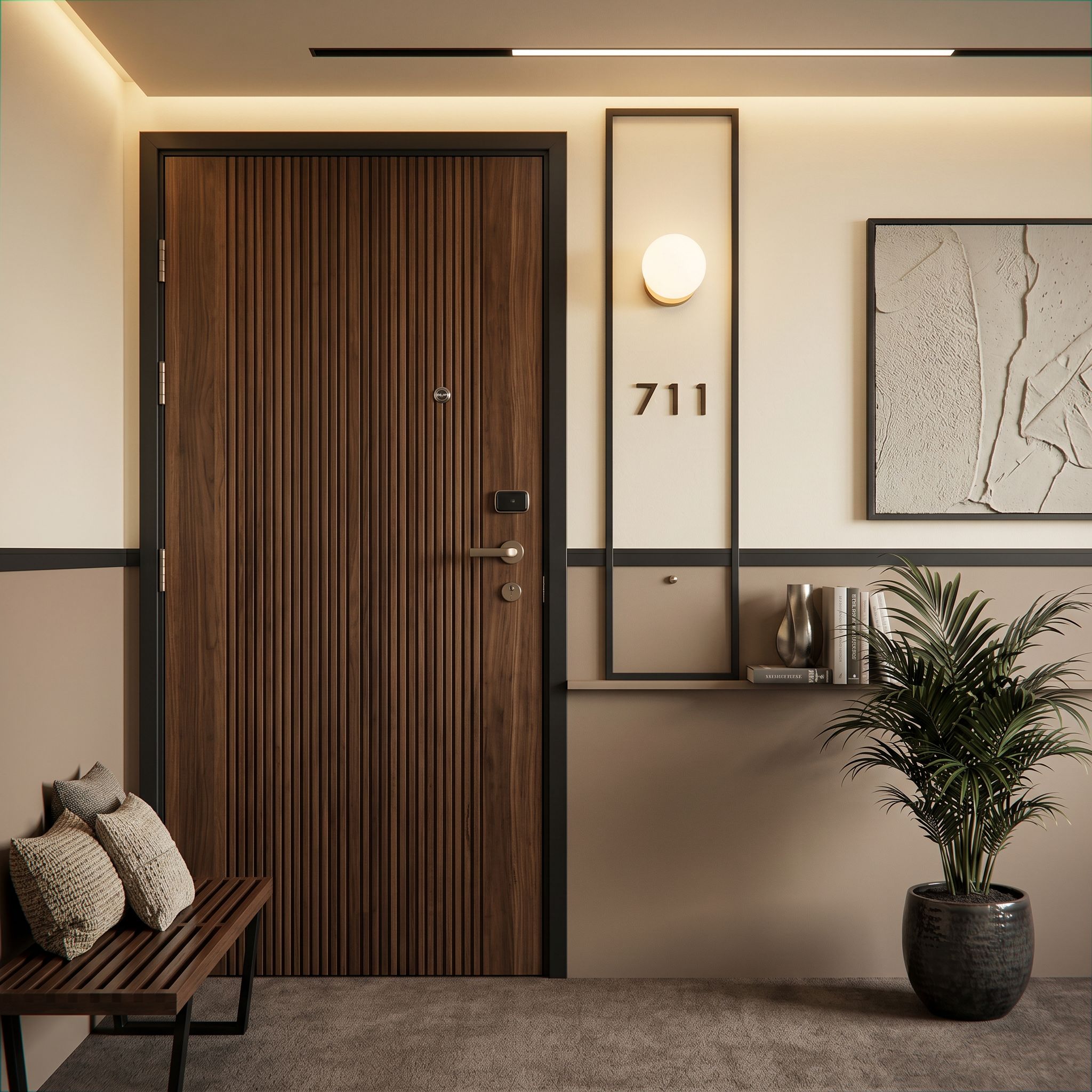 PromptColorize this image of a corridor door using the reference image as inspiration. Add new details such as a ceiling light, a new sconce to replace the one there and unit numbers. Remove the moulding above the chair rail. Change the moulding to match the reference image. Change the piece of artwork to be the one shown in the reference image or similar. Keep the same angle and view extents., keep exact camera angle