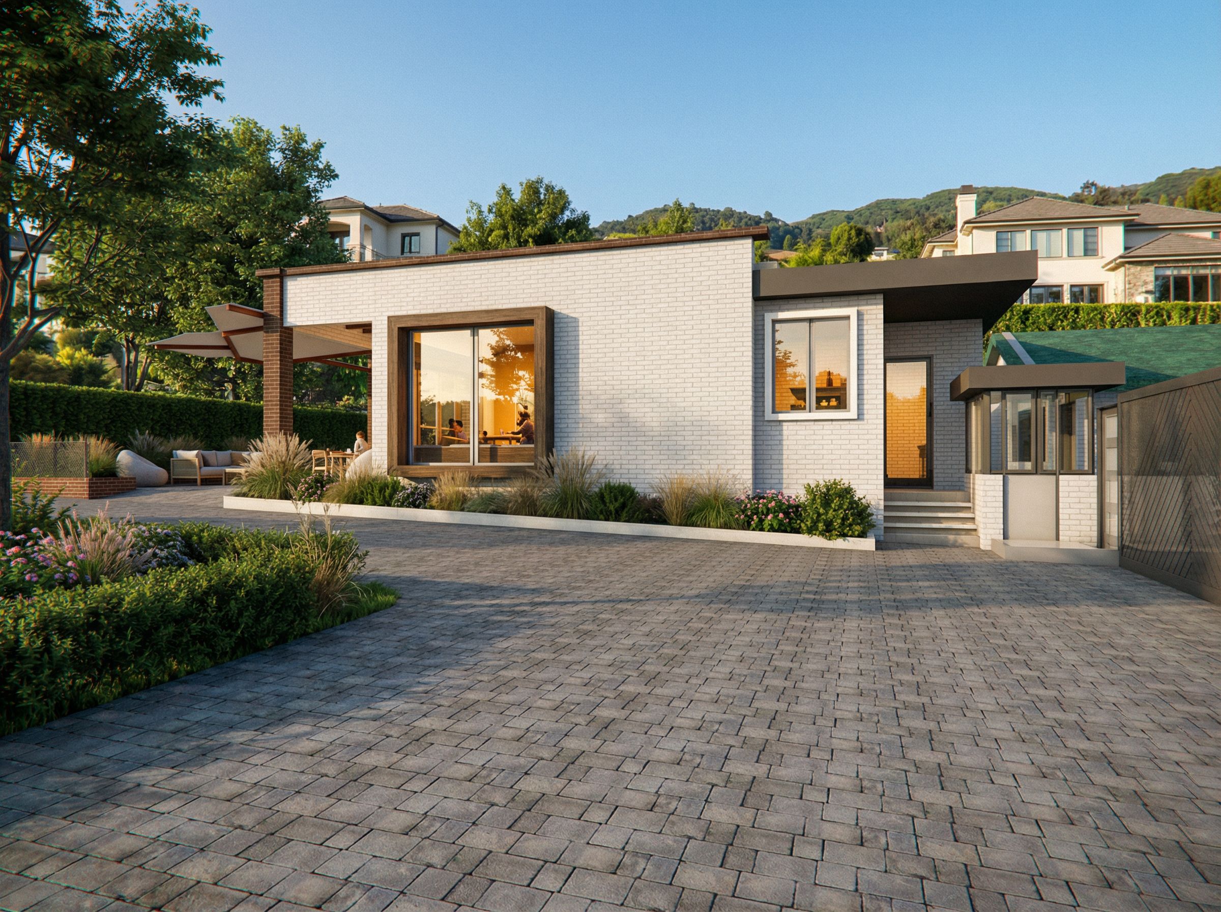 modern rstuarant and cofee shope in ahigh scale residential neighbourhood,Natural vegetation ,lighting,high resolution.mantain the finishes provided, keep exact camera angle