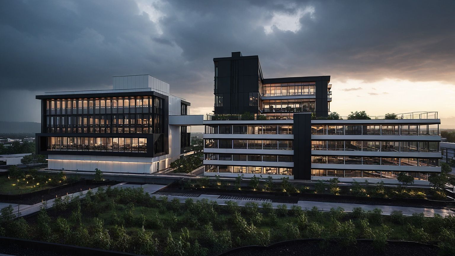 PromptHeavy overcast + raining + dusk sunset + Additional vegetation + Modern building facades + Steel black with glazing finish to all windows + lighting + sky rail color white