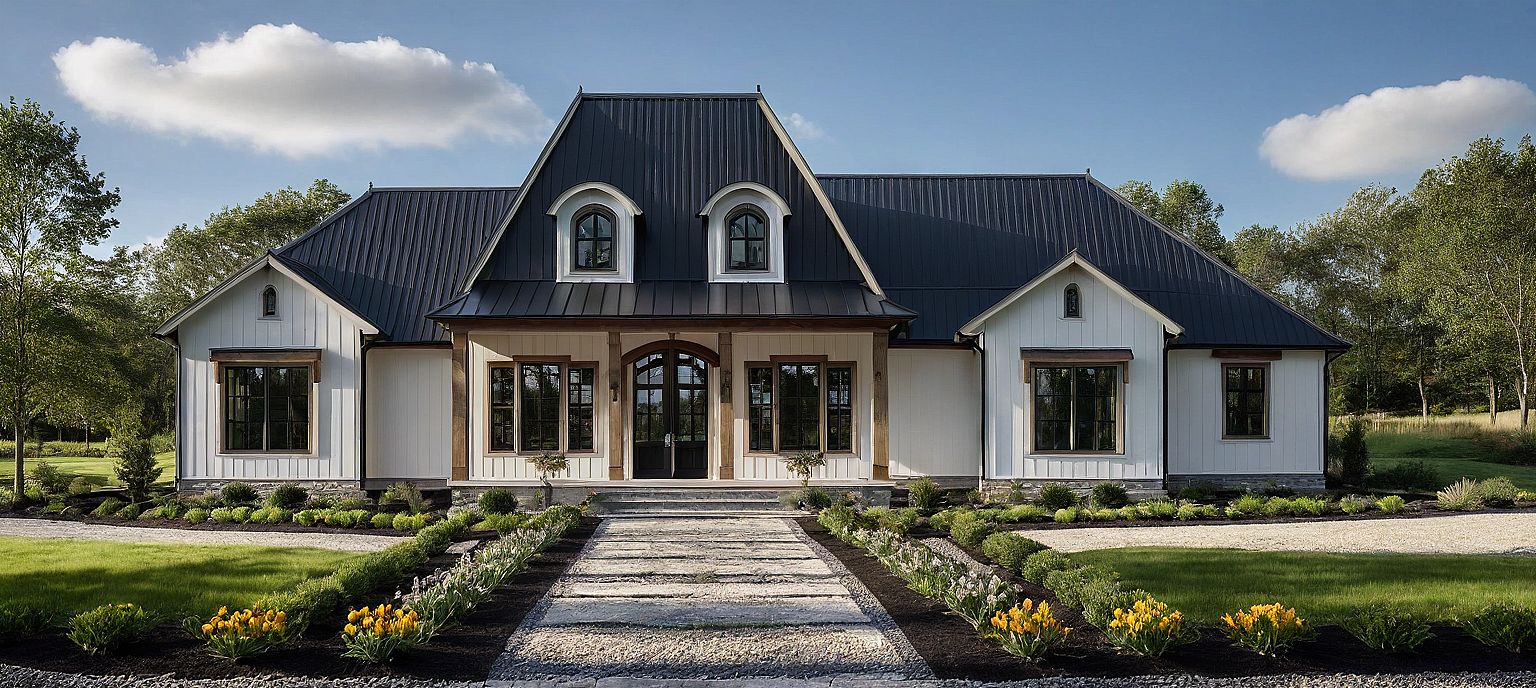 A photograph of a country French farmhouse, two-story house with white horizontal and board and batten mixed siding, large, black-framed windows, and a steep, dark grey shingle roof. The front yard features well-manicured green grass, vibrant flower beds, and a stone pathway leading to the entrance.