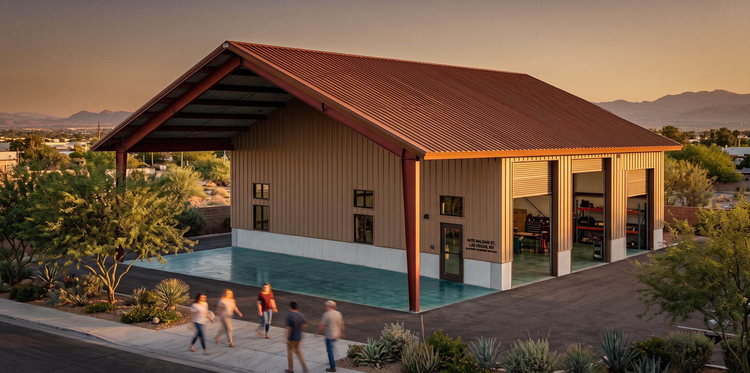 PromptAccessory Equipment Building located at 6475 Balsam St. Las Vegas, NV 89131. Windows and large steel rollup doors on side. Steel building with corrugated metal roof colored saddle up from sherwin williams color # 9099 trim to be Rustic Red from sherwin williams color number 7593, keep exact camera angle