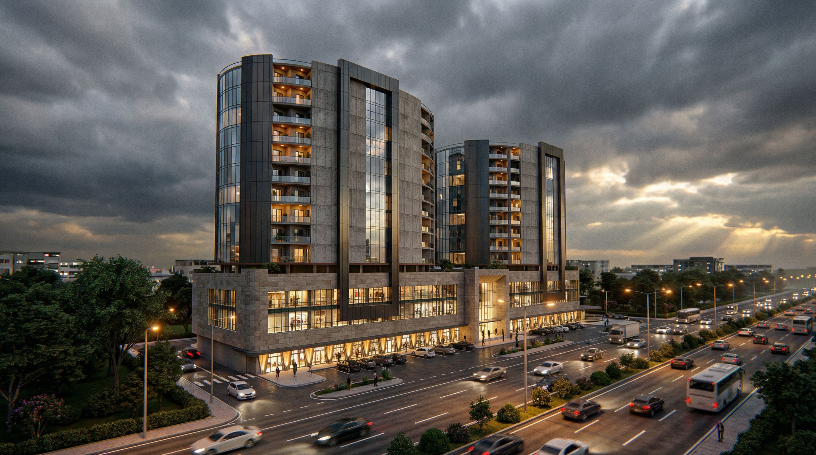 Photo of a modern commercial building featuring sleek geometric forms and extensive glass facades. The structure showcases a blend of smooth concrete and metallic materials, with large windows reflecting the surroundings. Situated in an urban environment, adjacent to a well-paved parking area with vehicles. The sky is overcast, casting soft shadows on the building, with rays of light piercing through the clouds. Captured from a low-angle perspective to emphasize the height and scale, using a wide-angle lens to incorporate the surrounding landscape. the two buildings are residential and the podium, is a mall.. put the project on a highway.. you are free to change the facade elevations .. render this scene and make it super realistic and change the materials in a modern way and make it alive and enhance the design , keep exact camera angle