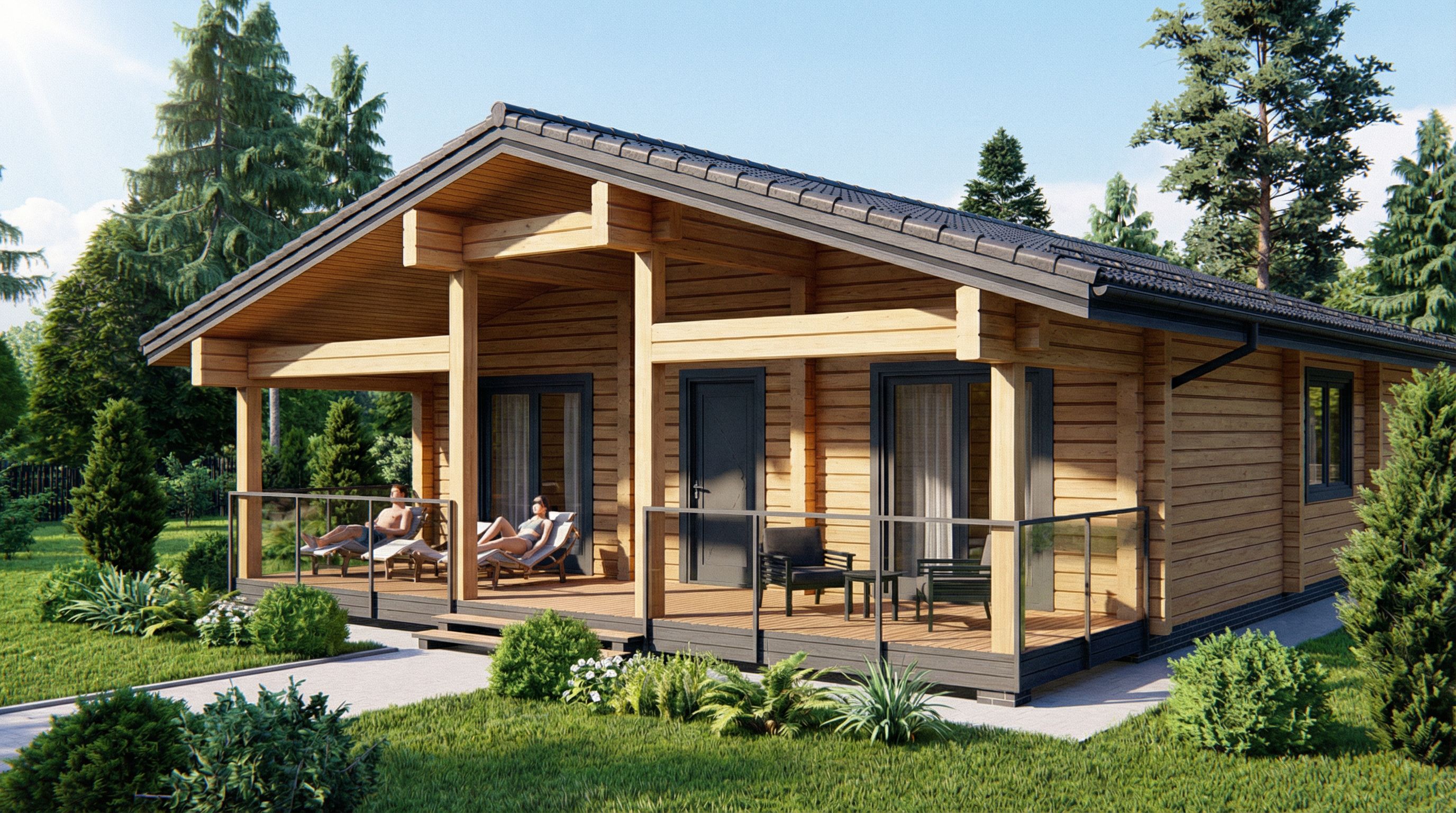 Prompta wooden house made of glued laminated timber with a dark roof and dark window frames, keep exact camera angle