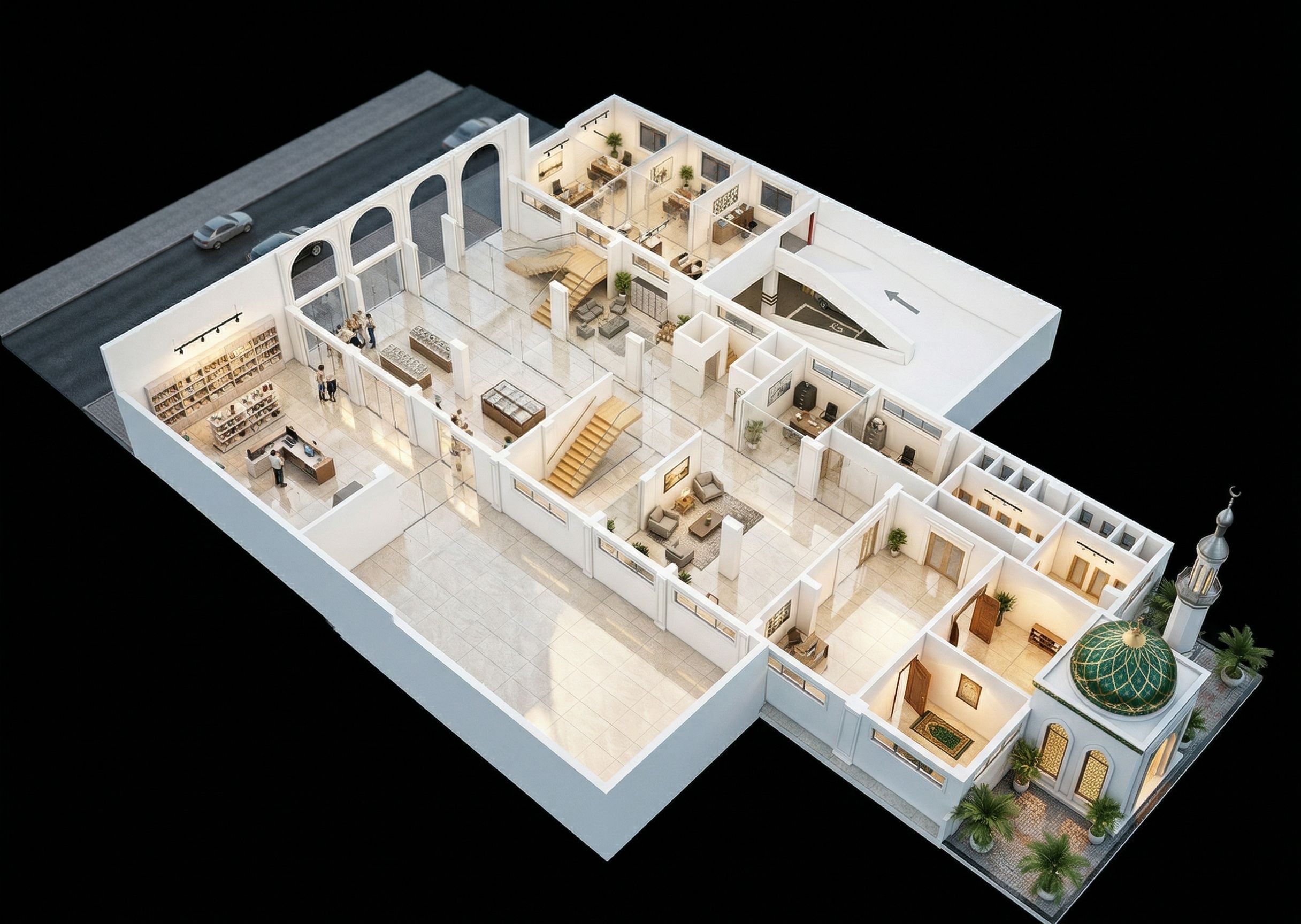 AERIAL VIEW OF A COMMERCIAL LAYOUT WITH LIGHTS TURNED ON IN THE HOUSE. SHOPS AT THE FRONT AND INSIDE. A MOSQUE IN THE BOTTOM RIGHT CORNER. USE GLASS BALUSTRADES ON THE STAIR. FRAMELESS GLASS PARTITIONS IN SHOPS . VEHICULAR RAMP SHOWN IN RED BUT USE WHITE CONCRETE TO BASEMENT . INCLUDE MOULDINGS IN WINDOWS AND OPENINGS. USE BRILLIANT WHITE ON THE WALLS . MAKE THE GLASS CLEAR, REALISTIC AND TRANSPARENT. USE CERAMIC TILES ON FLOOR. MAKE IMAGE BRIGHT HIGH RESOLUTION 8K WITH A BLACK BACKGROUND. make image high resolution for printing in aA0., keep exact camera angle