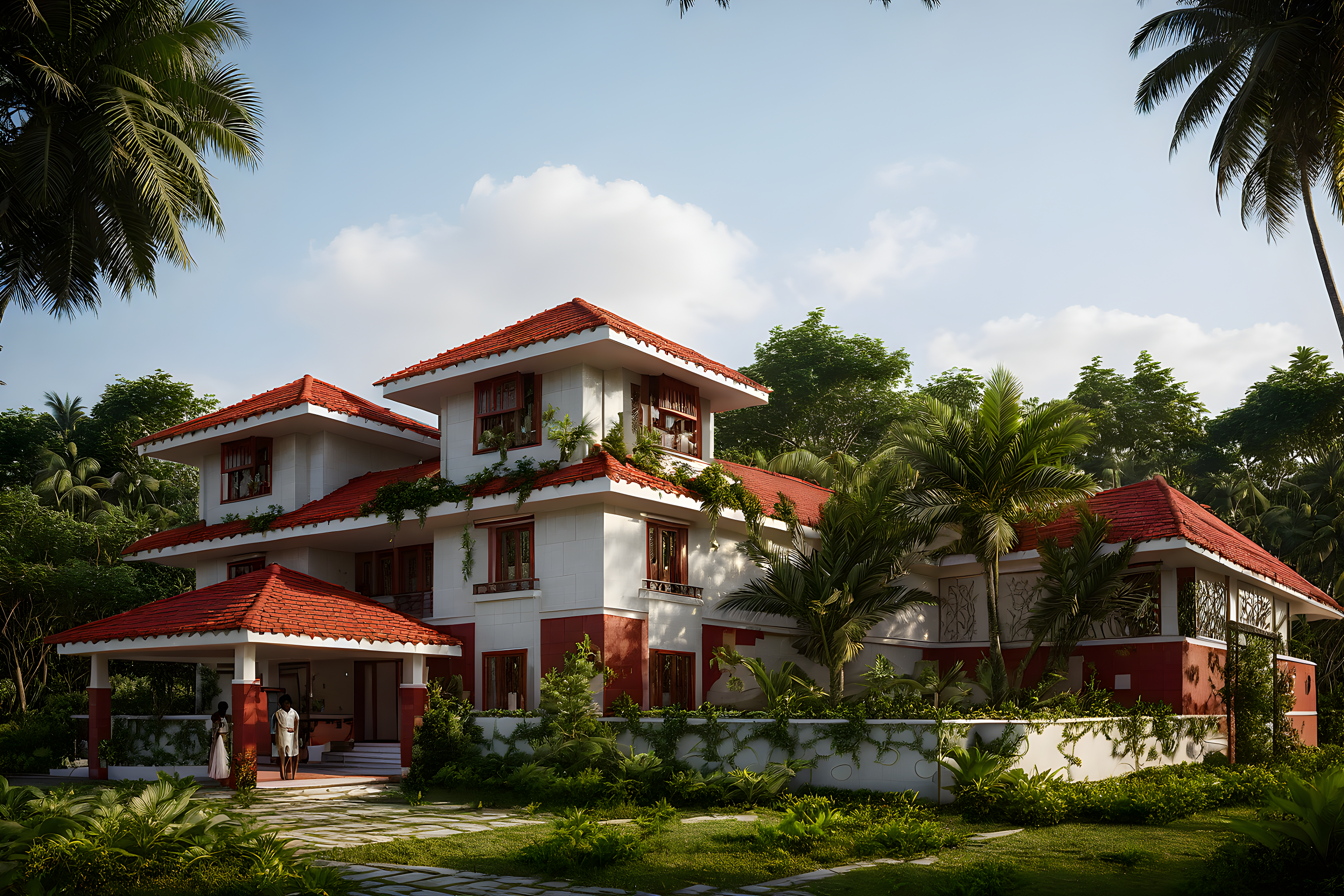 PromptA detailed photo of a beautiful Beach house located in South India, Chennai with greenish lawn and surrounded with Coconut trees and thick Greenish trees. Slopped roofing tiles should be in Mangalore red terracotta color. Two South Indian people should be in entrance portico. Red color tiles in sloped roof parapet.