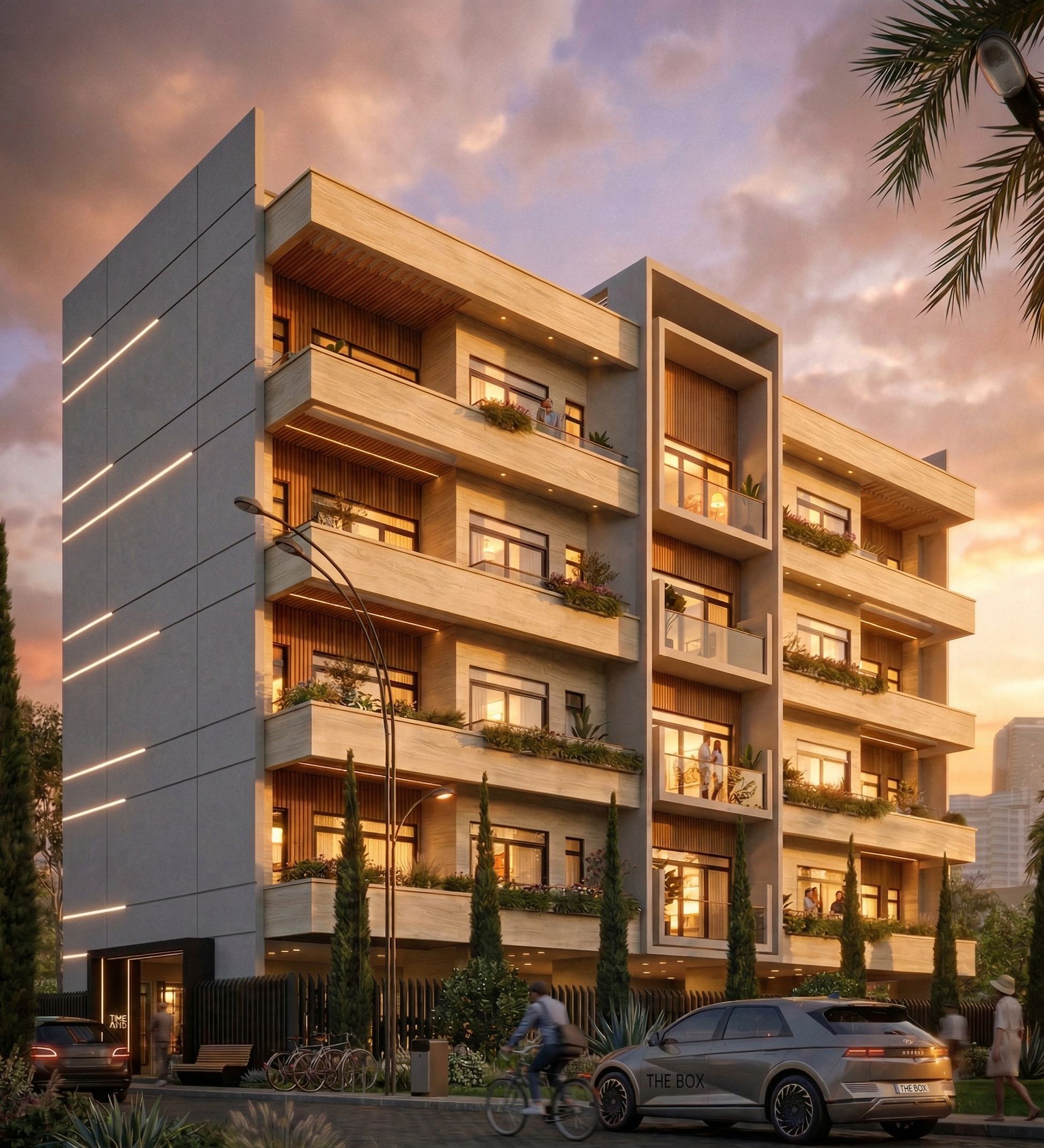 Promptdo a golden hour scene of this render with warm lighting in the building