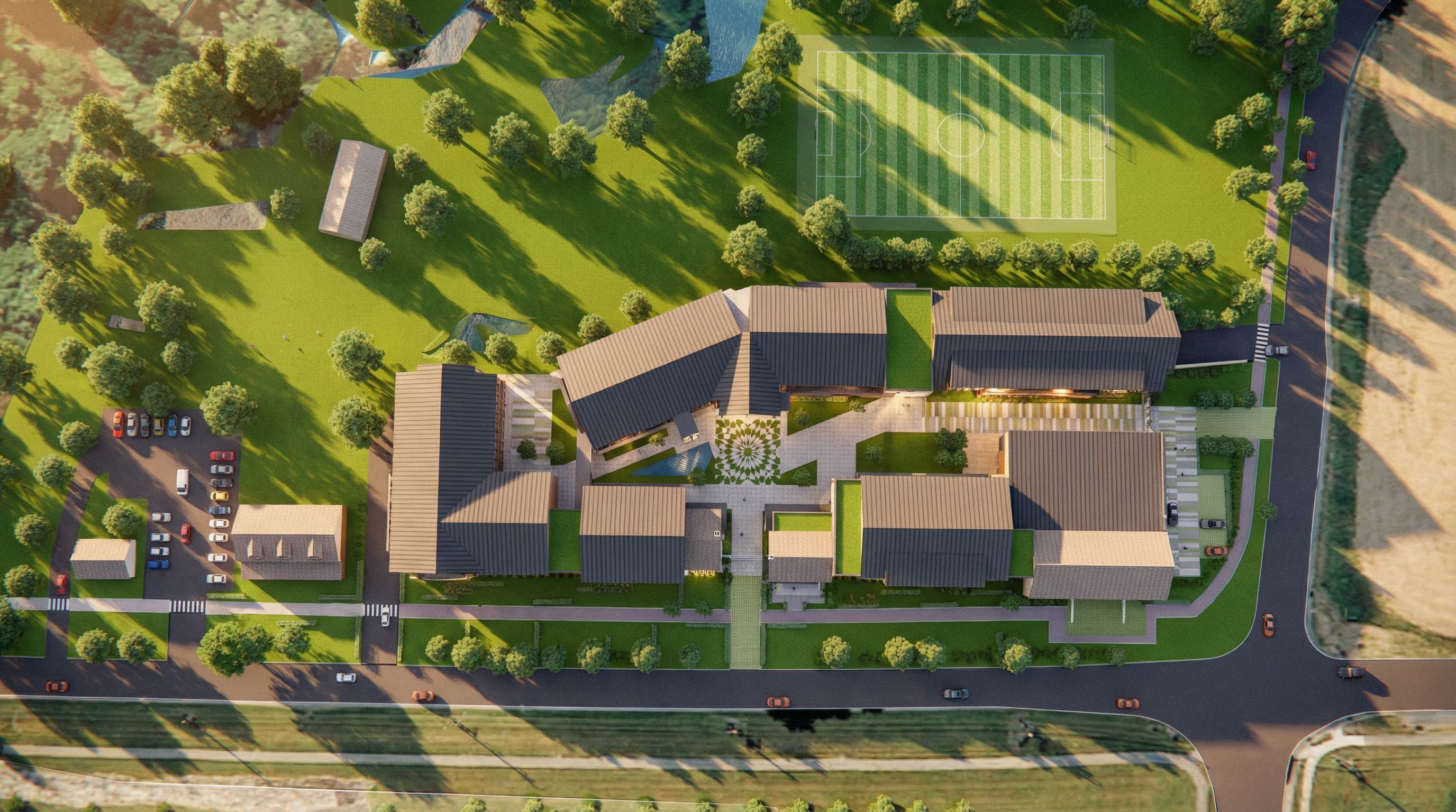 PromptPhoto of a multi-building educational complex set within a lush landscape. Emphasize the sleek, modern architectural details, timber and glass materials, and geometric rooflines. The urban setting features surrounding greenery, a sports field, and well-planned pathways connecting the structures. Natural lighting conditions during midday create soft shadows and reflective highlights on surfaces. Capture a bird’s-eye perspective, showcasing the layout and harmony of the buildings with their environment, using a wide-angle lens for a comprehensive view. keep the camera angle, keep exact camera angle