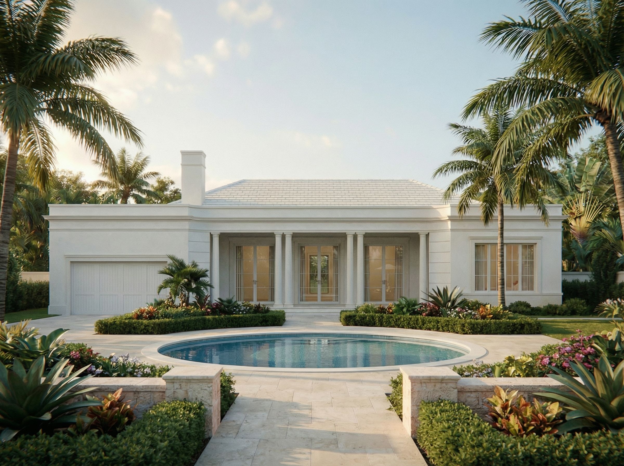Promptchange only what i tell you to. remove furniture. pool should be a more elongated oval shape. with the major axis running perpendicular to the center axis of the house. , keep exact camera angle
