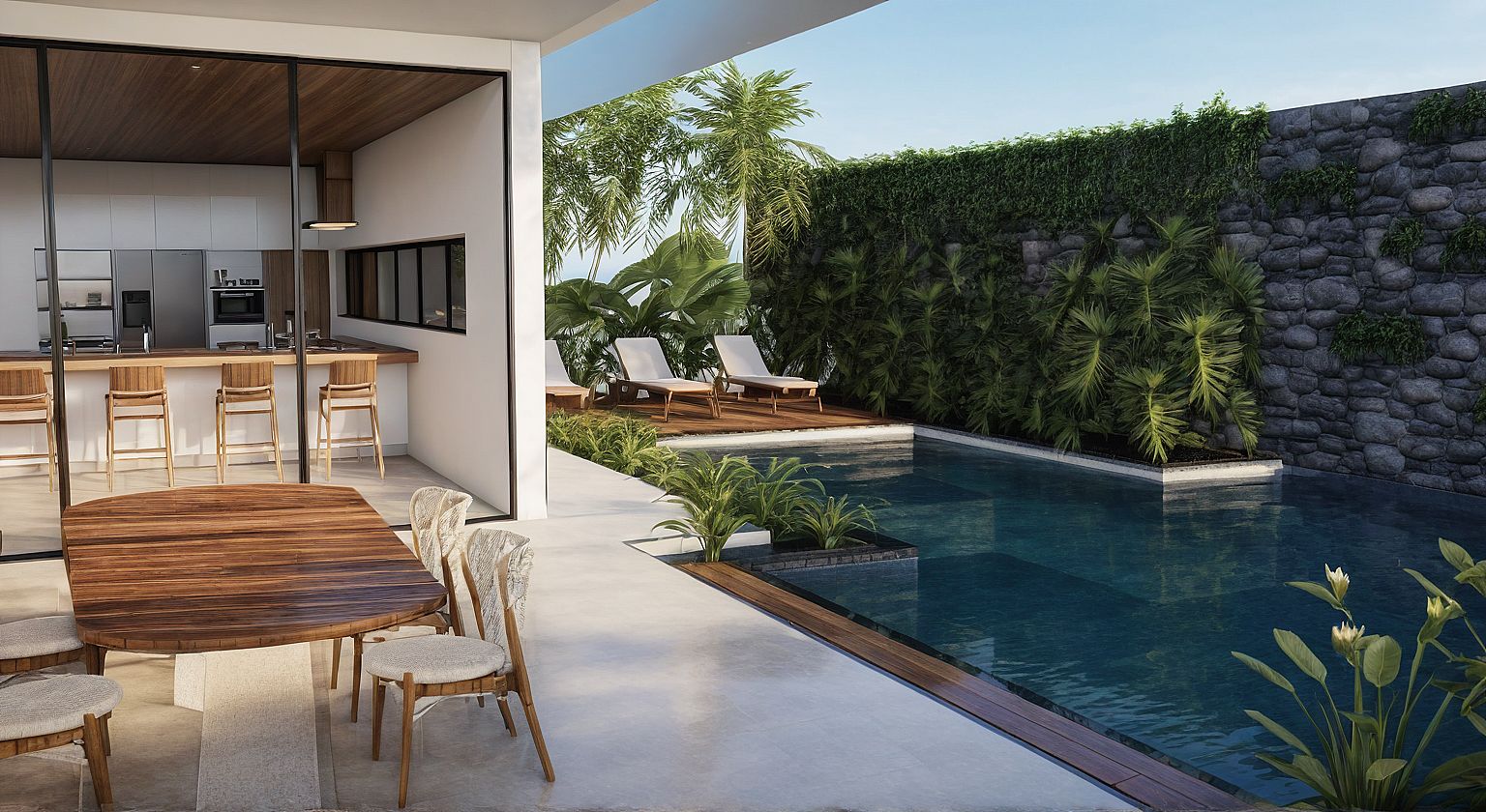 Promptrealista, preciso, piscina, textura viva, piso de madeira ao redor da piscina