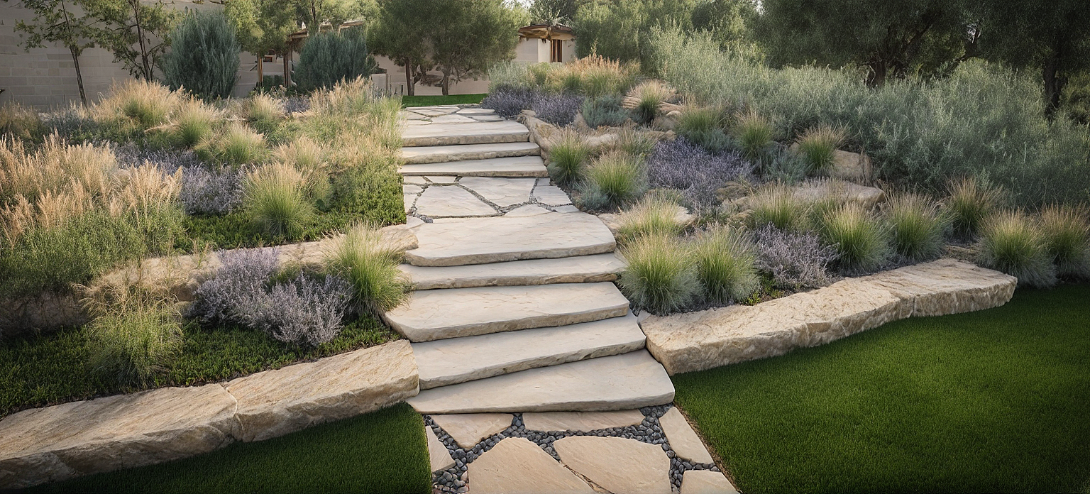Promptturf lawn, limestone retaining wall, perennial grasses, juniper trees, Russian sage, flagstone