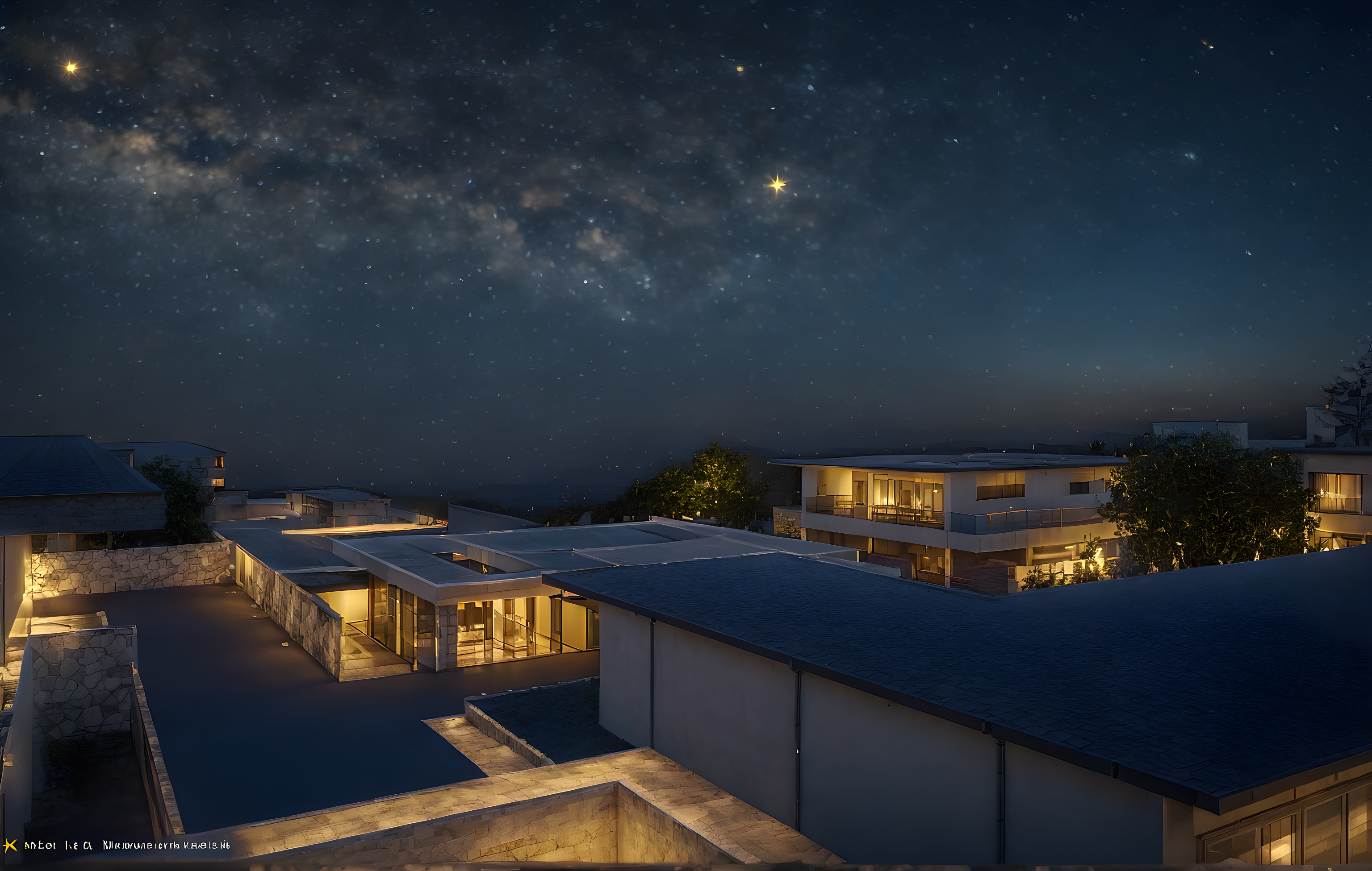 Promptnight sky with star surrounding and shine every window have warm yellow light