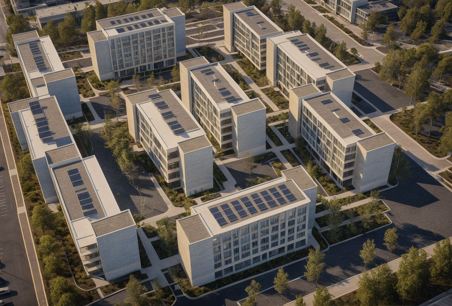 PromptPhoto of a modern five Storey multi-unit residential-student complex layout featuring, flat roof with solar panels- interconnected buildings, emphasizing modular design with flat roof and green spaces with pedestrian pathways adjoining the buildings. Architectural details include structured balconies, large windows, and vibrant landscaping with trees and pathways. Urban setting includes parking areas around and surrounding the structures in a suburban context of a university. Optimal natural lighting highlights textures and shadows during late afternoon. Captured from a bird's-eye view with a wide-angle lens, framing the entire complex and showcasing its symmetry and integration with the environment.
