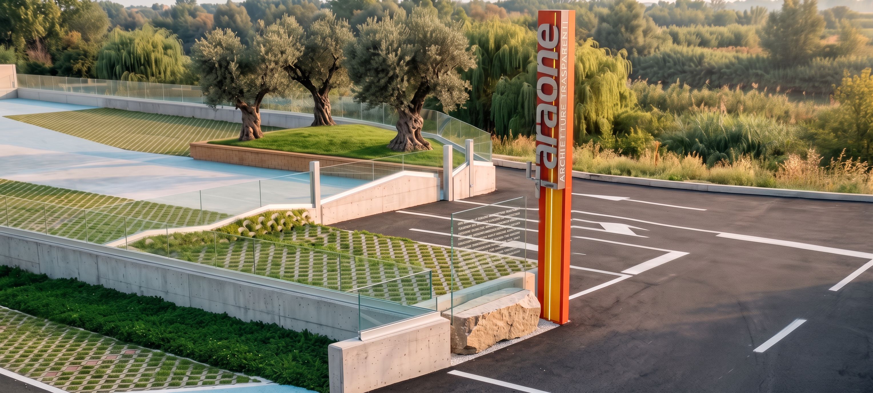 Consider the stone placed at the entrance under the totem. Make a cut 4 cm thick and 50 cm deep on the top of the stone in a longitudinal direction and fit inside it a transparent glass 1 meters high and 0,6 meter wide with a series of 10-line texts in black color indicating the company's mission, printed on the glass; You have to see the cut of the stone with the glass that fits into the cut. The writing "architetture trasparenti" must be illuminated with internal LEDs. The vertical grey text "faraone" must be chrome. , keep exact camera angle