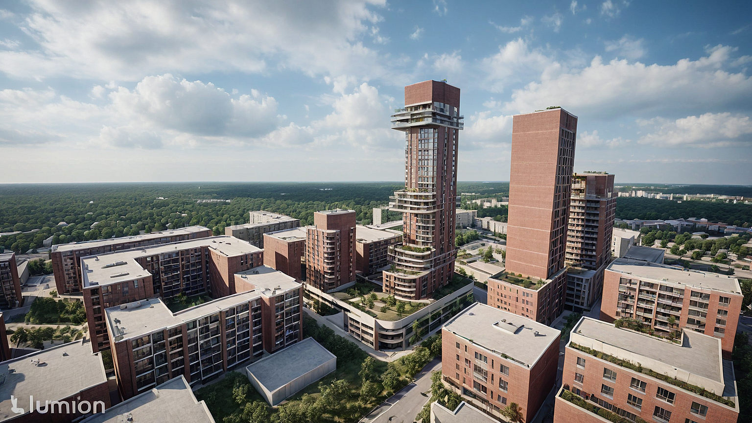 high rise brick condo in a concrete city with busy streets