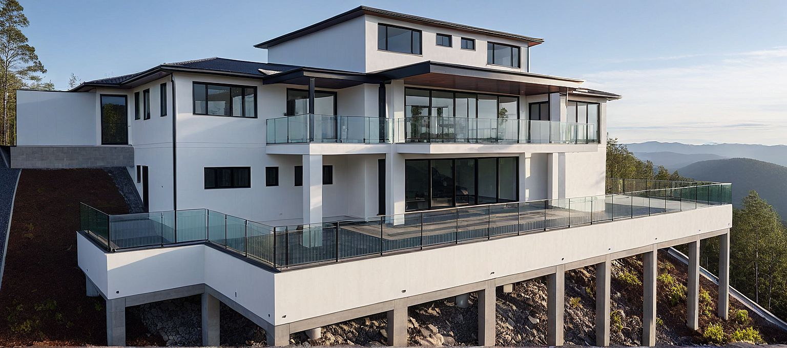 PromptPhoto of a modern residential house elevated on stilts, featuring large glass windows and a spacious balcony with sleek black iron balustrade. Building design highlights include sleek white walls, a minimalist white roofline. Situated in a wooded mountain landscape, the environment is tranquil. Soft natural lighting brings out the textures of the materials, with delicate shadows cast by the railing. Captured from a slightly elevated angle using a wide-angle lens to emphasize the elevation and modern aesthetics of the design.