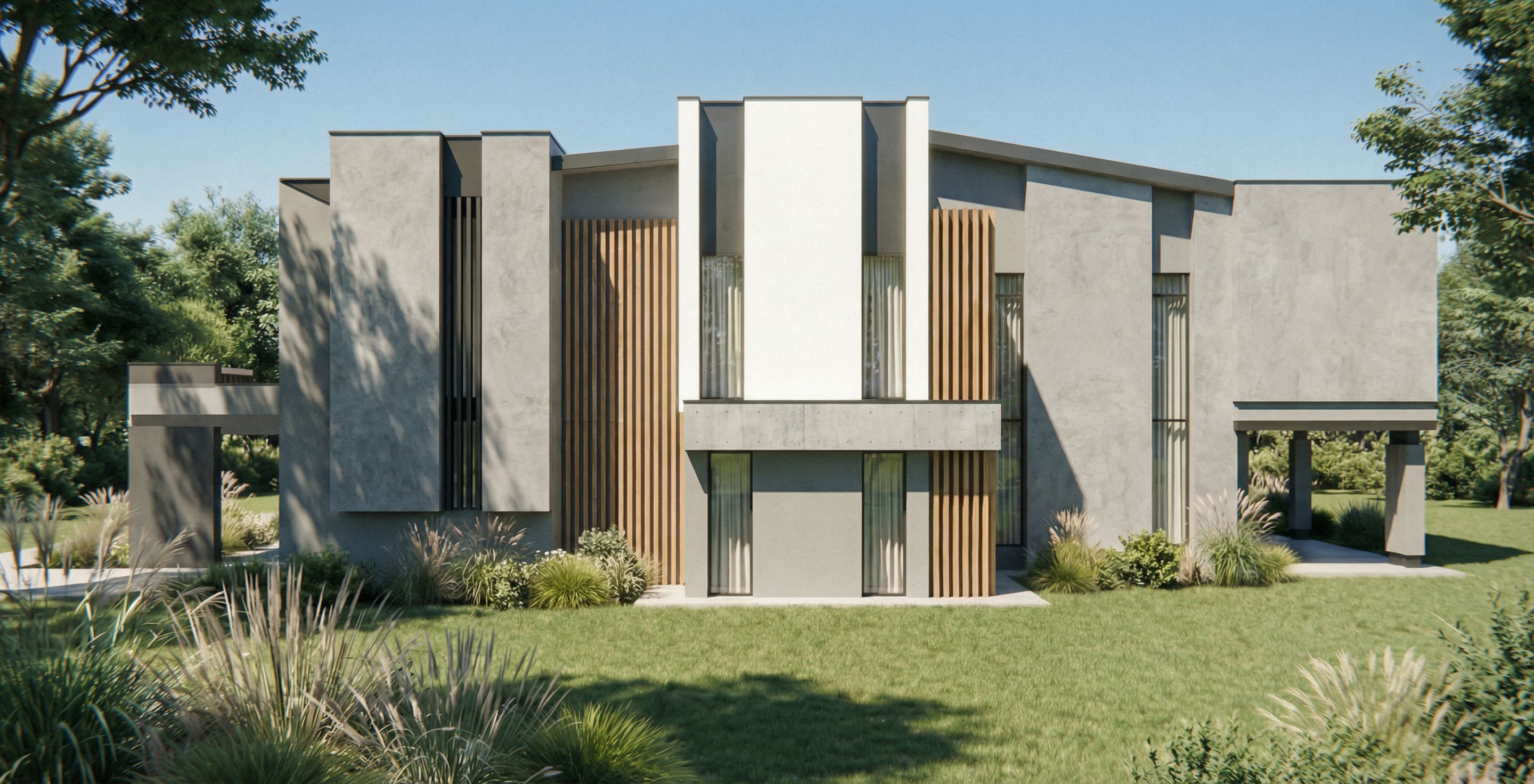 Promptmodern minimalist concrete house, two-story contemporary architecture, **right side facade of the house**, lateral right elevation view, large cantilevered roof, floor-to-ceiling glass windows with light curtains inside, dark metal accents and vertical louvers, minimalist architectural composition. **Areas marked in red should be finished with gray microcement.** No cars, no driveway, no garden pathways or stepping stones. Natural landscaping only with ornamental grasses, shrubs and trees surrounding the side of the house, clean lawn area, calm residential environment, bright daylight scene, clear sky, soft natural sunlight, realistic shadows, architectural photography style, ultra realistic materials, global illumination, highly detailed textures, photorealistic architectural visualization, 8k render. IMPORTANT: strictly preserve the architecture from the reference image, do not redesign the building, do not change the facade layout, do not add or remove windows, volumes or structural elements, keep the exact same building shape, proportions, massing, structure and architectural composition. Maintain the original architectural design exactly as in the reference image. Only modify the surface material in the areas marked in red. Strictly follow the reference image architecture and keep the exact camera angle. , keep exact camera angle