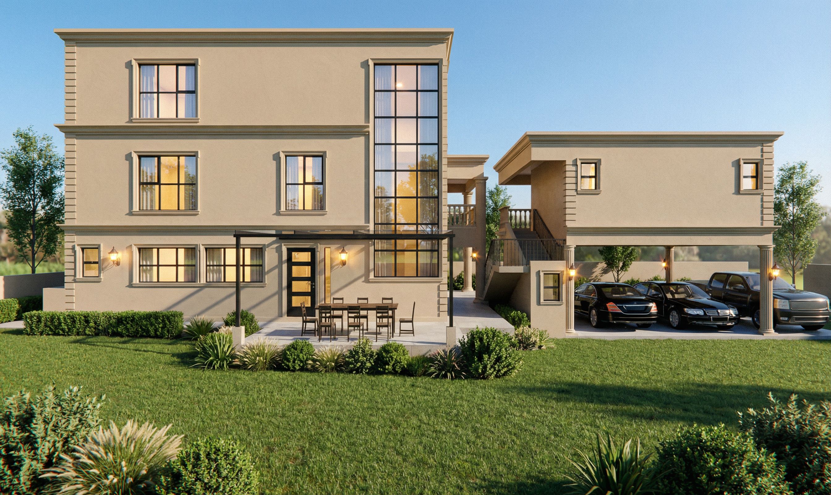 Create a daytime ultra-photorealistic architectural render of a classical residence. The house features symmetrical classical proportions with smooth warm beige plaster walls, decorative corner quoins, moulded cornices, and black aluminium framed windows and doors with clear reflective glazing. A projecting upper floor volume forms a covered carport supported by slender classical columns, sheltering cars beneath. The outdoor dining is shaded by a black steel and clear glass pergola. Surround the house with a neatly maintained lawn and integrate lush landscaping including low ornamental bushes and trimmed shrubs along the foundation edges. Add several medium-height trees and soft background vegetation beyond the boundary wall to create depth and a natural suburban setting. Lighting should depict bright natural daylight under a clear sky, producing soft but defined shadows across the façade. All exterior lantern-style wall lights mounted beside doors and windows should be turned on, and interior lighting should also be visible through the windows to create a lived-in atmosphere., keep exact camera angle